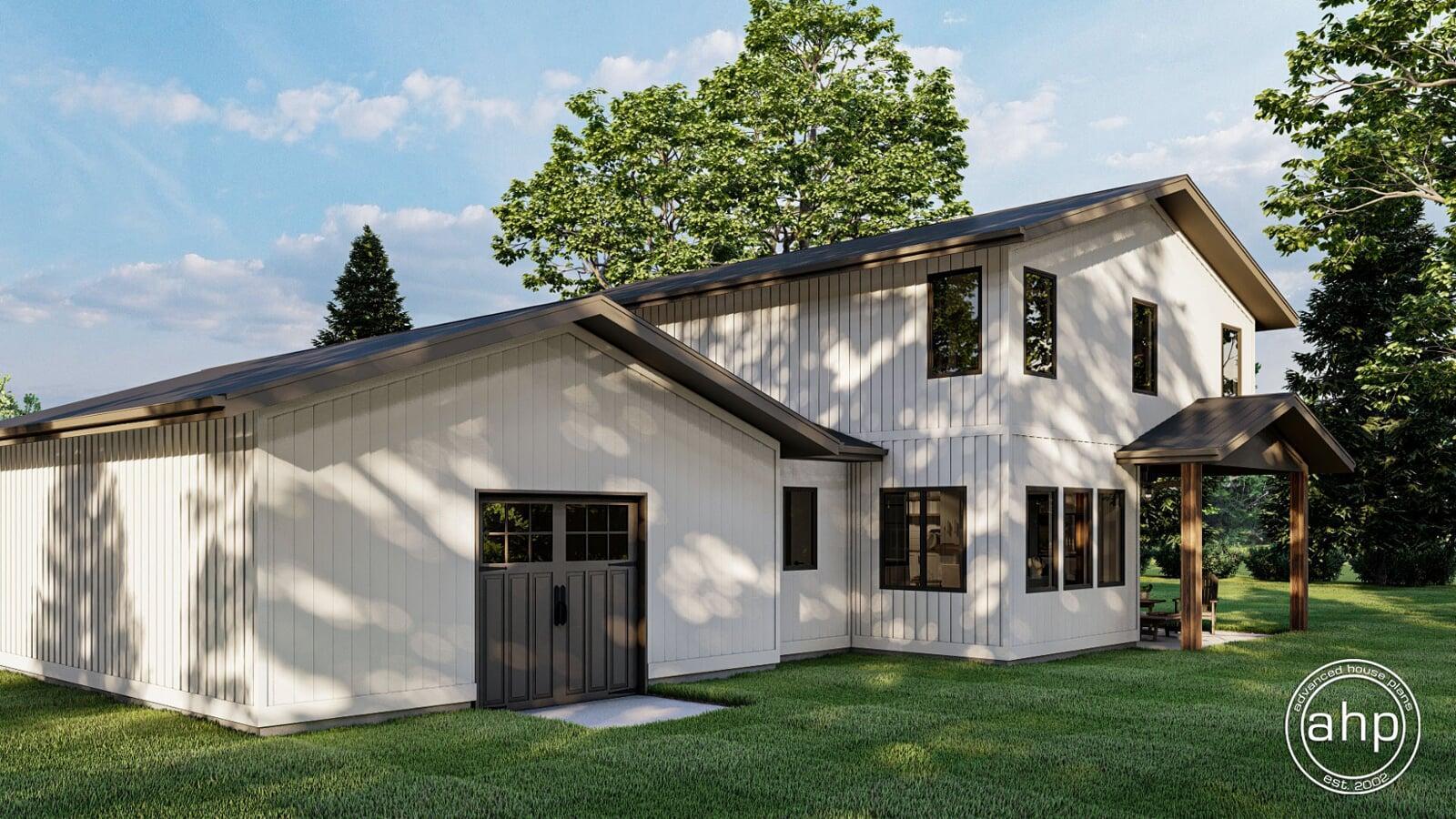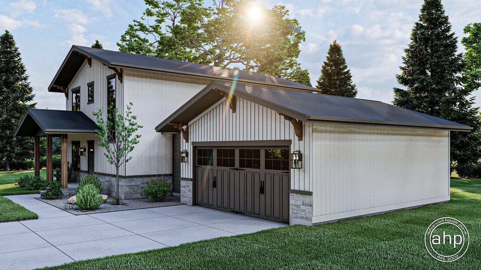 The Belgrade is a Barndominium style 2 story house plan with a simple yet elegant exterior and a functional, simple floor plan. This home looks great from the street with its contrasting siding colors combined with wood and stone accents!