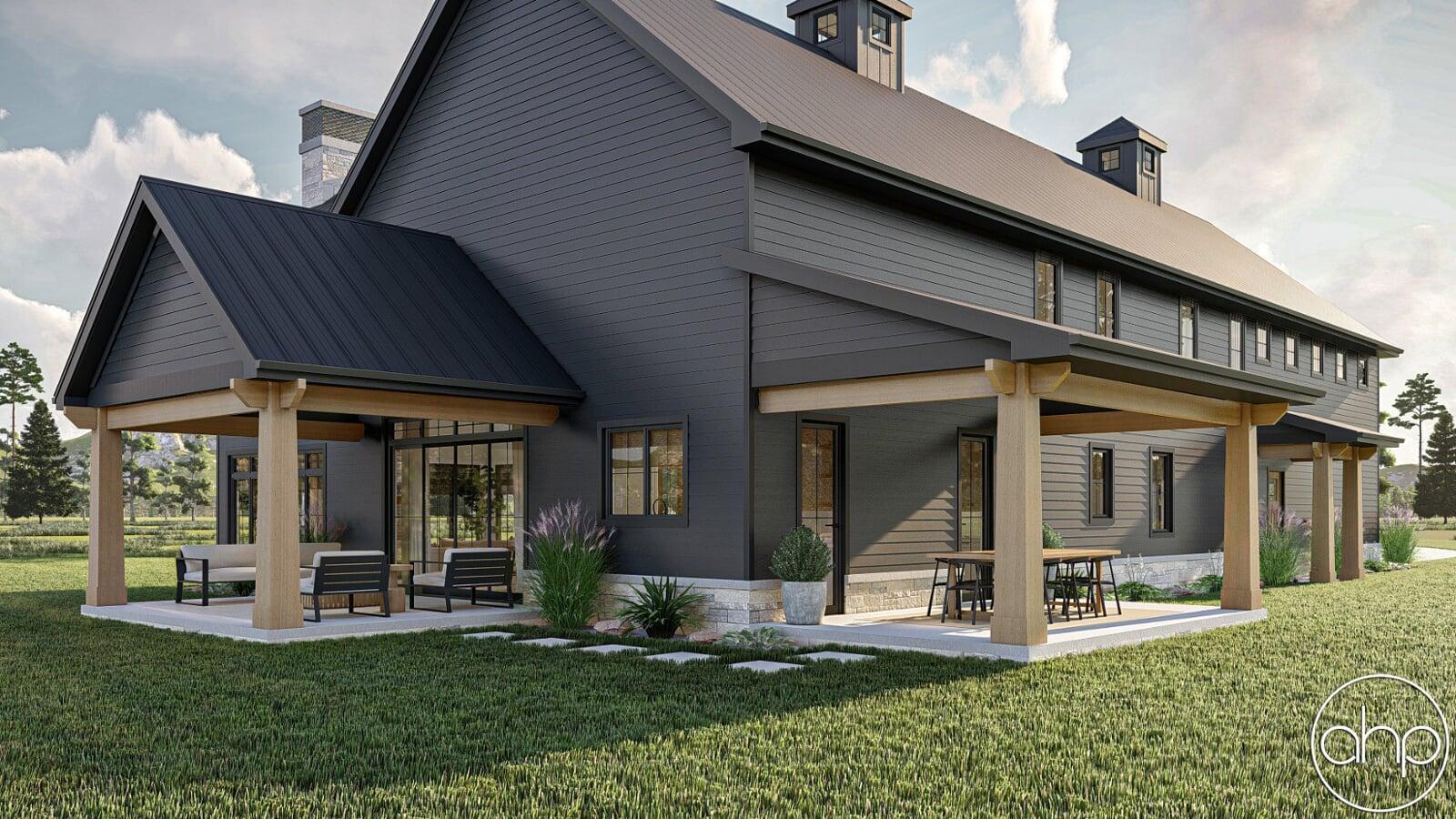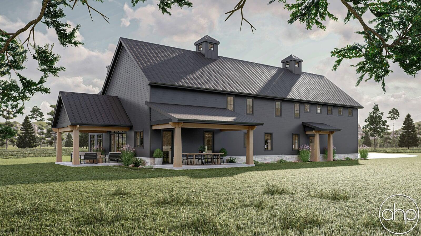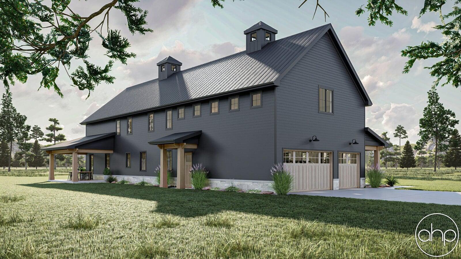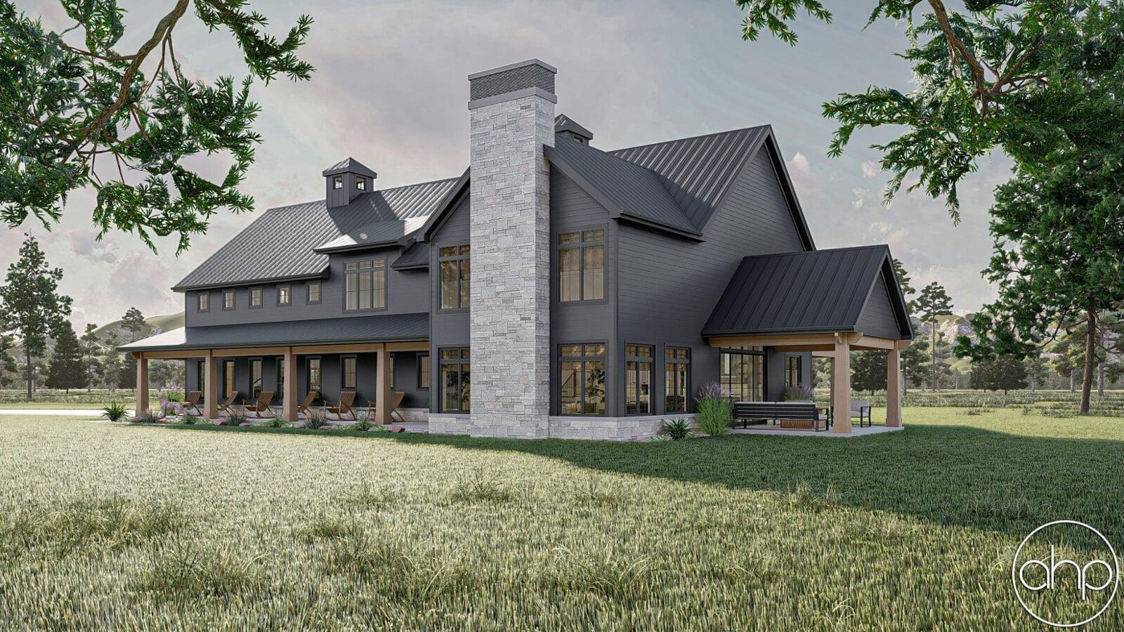 The Cottonwood Creek plan is a barndominium style house plan with 2734 square feet, 4 bedrooms, and 3 bathrooms. With a huge covered front porch on three different sides of the home, as well as the dark exterior with stone and wood accents provides a beautiful exterior and ultimate curb appeal.
