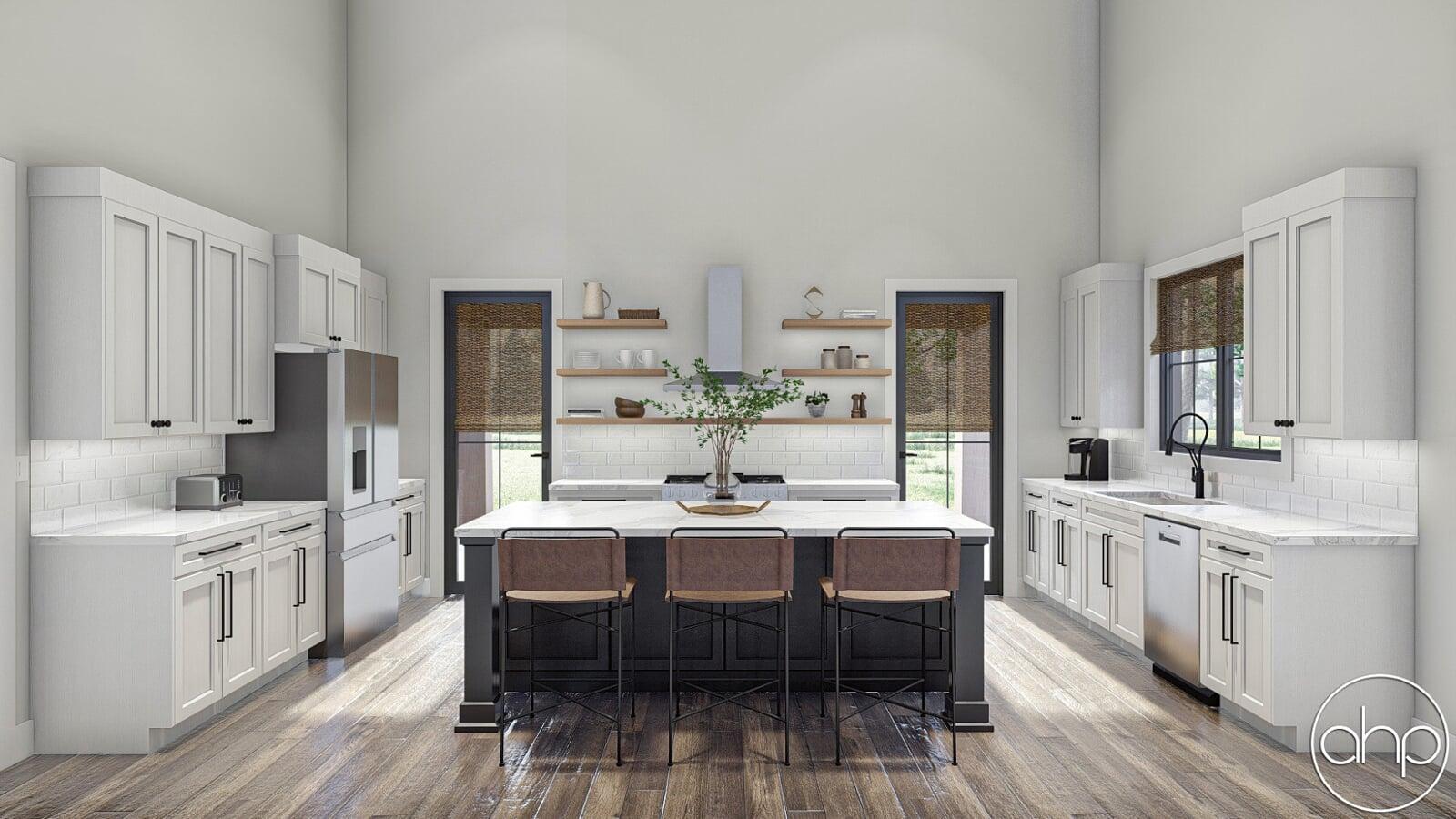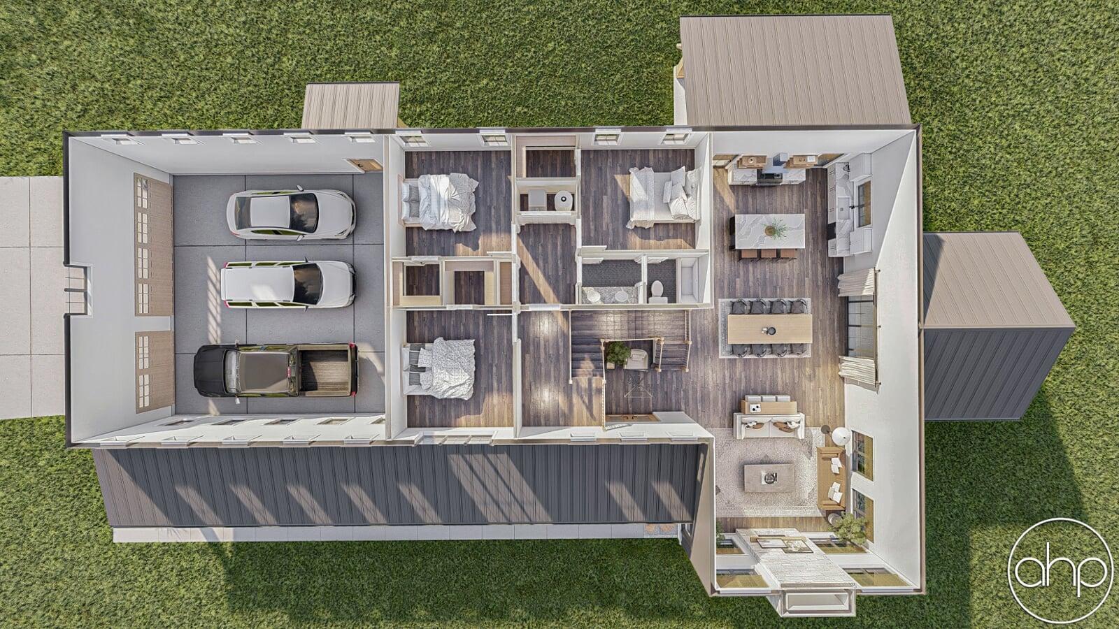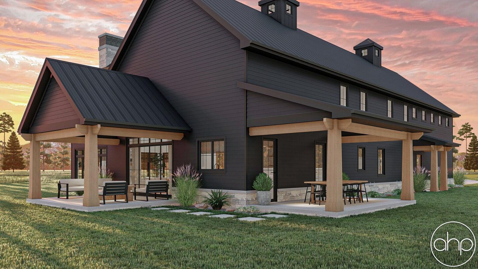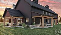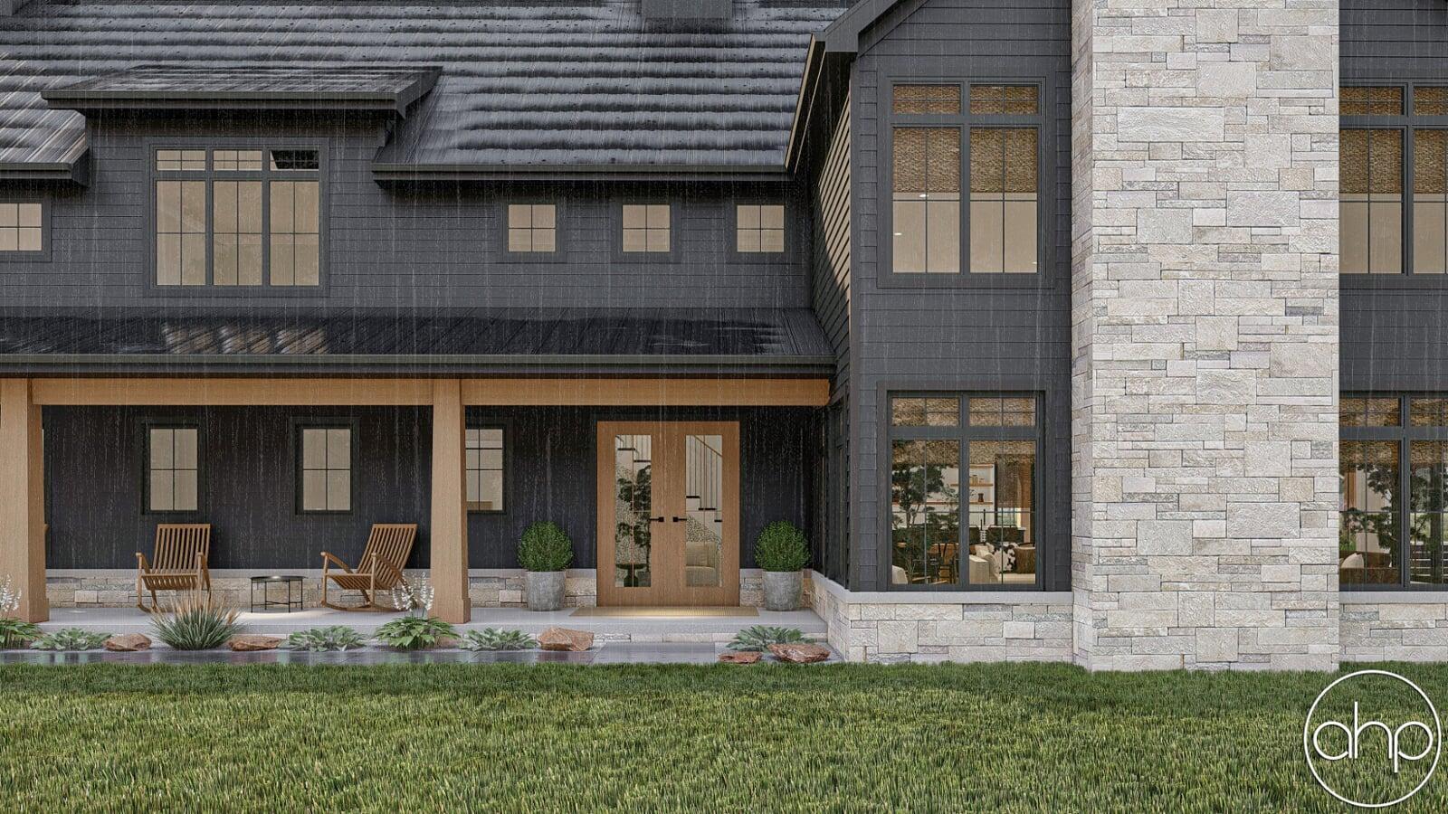 The Cottonwood Creek plan is a barndominium style house plan with 2734 square feet, 4 bedrooms, and 3 bathrooms. With a huge covered front porch on three different sides of the home, as well as the dark exterior with stone and wood accents provides a beautiful exterior and ultimate curb appeal.