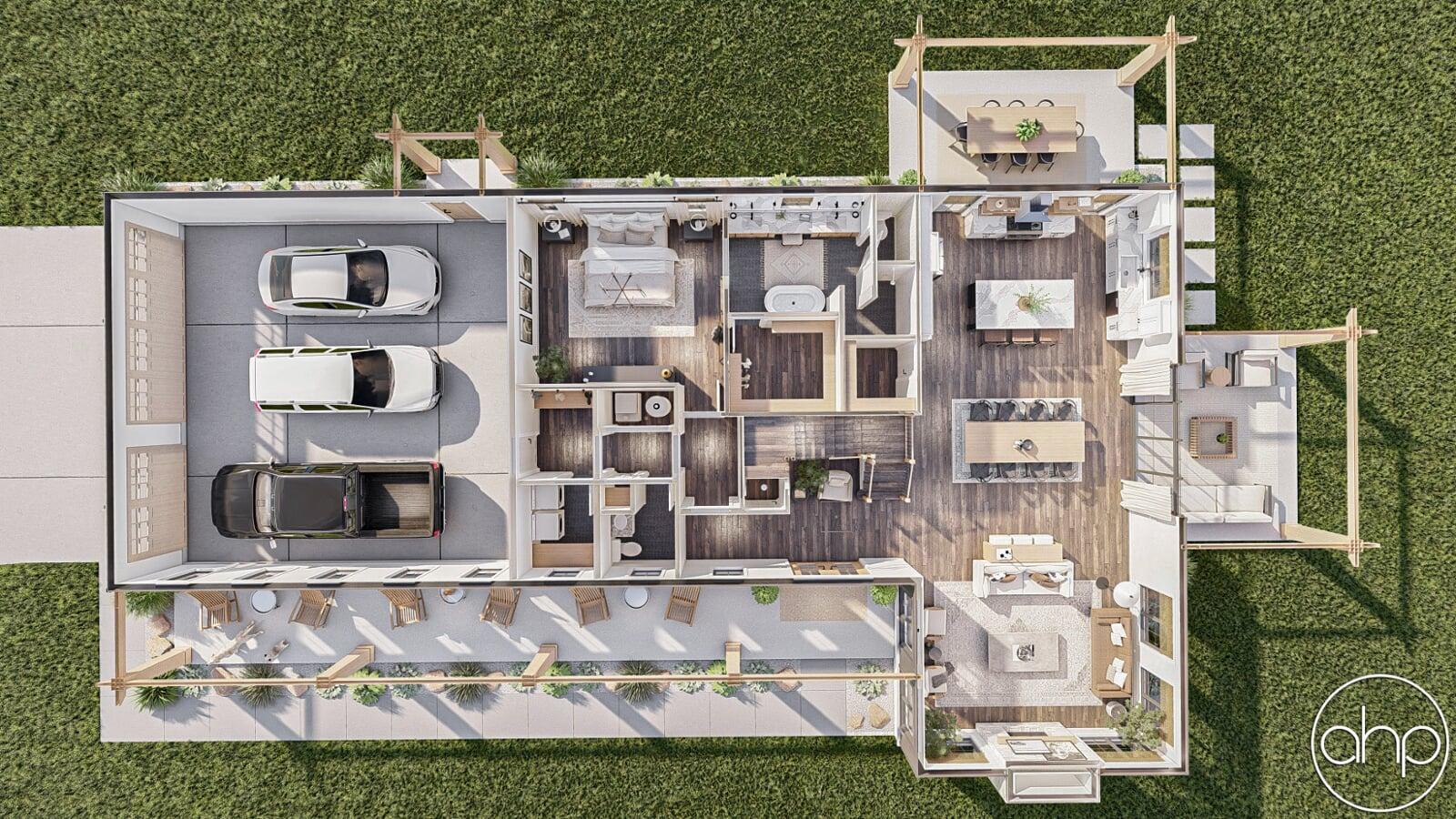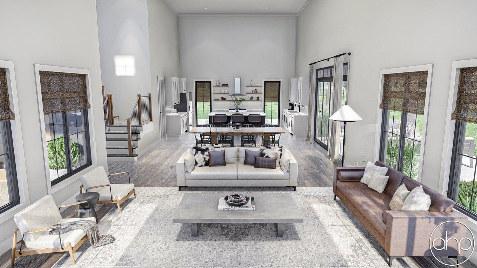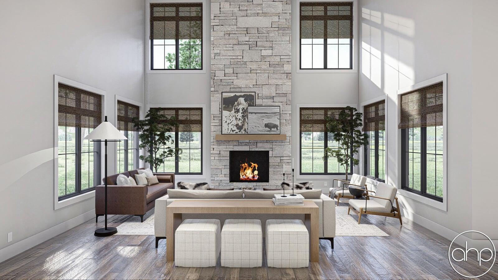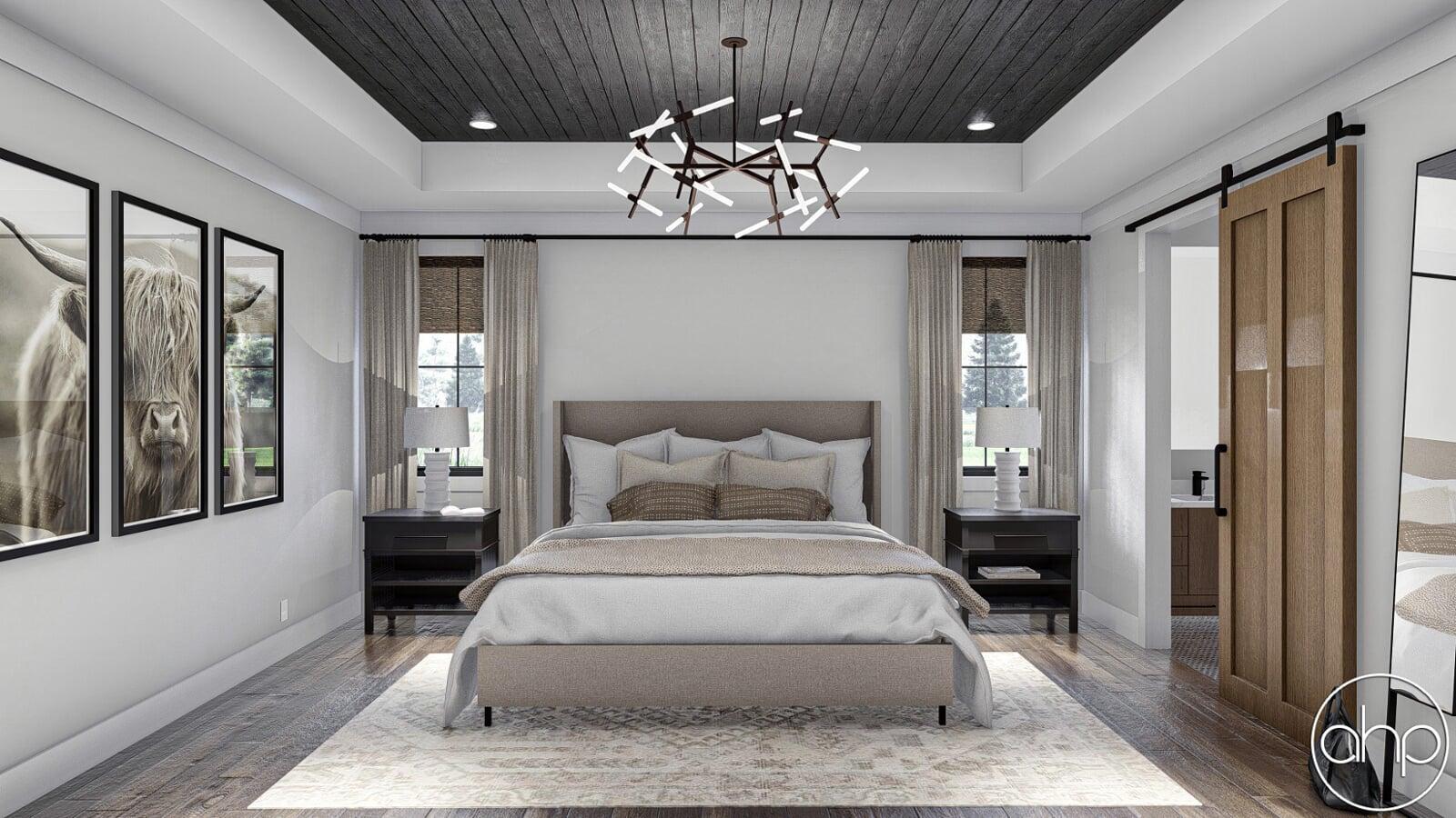 The Cottonwood Creek plan is a barndominium style house plan with 2734 square feet, 4 bedrooms, and 3 bathrooms. With a huge covered front porch on three different sides of the home, as well as the dark exterior with stone and wood accents provides a beautiful exterior and ultimate curb appeal.