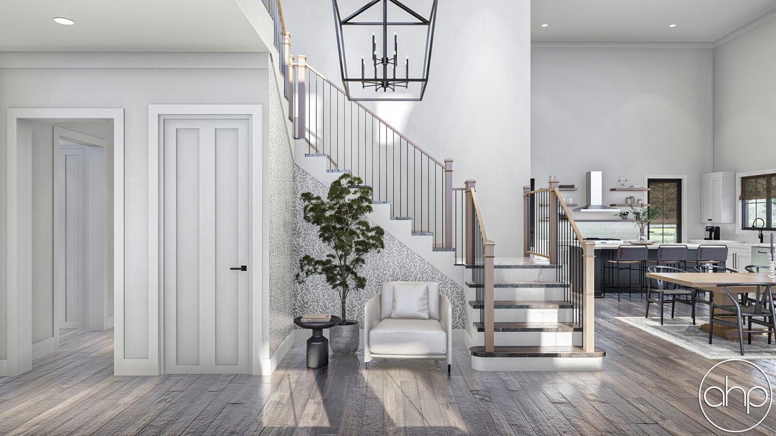 The inside of the home is open concept, starting with a stunning entryway with a two-story ceiling as soon as you walk in the front door. The kitchen, great room, and dining room are all found on the right side of the home, with a built-in fireplace, walk-in pantry, and access to another covered porch included in this area.