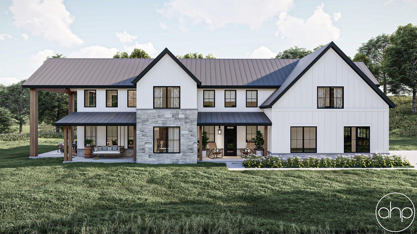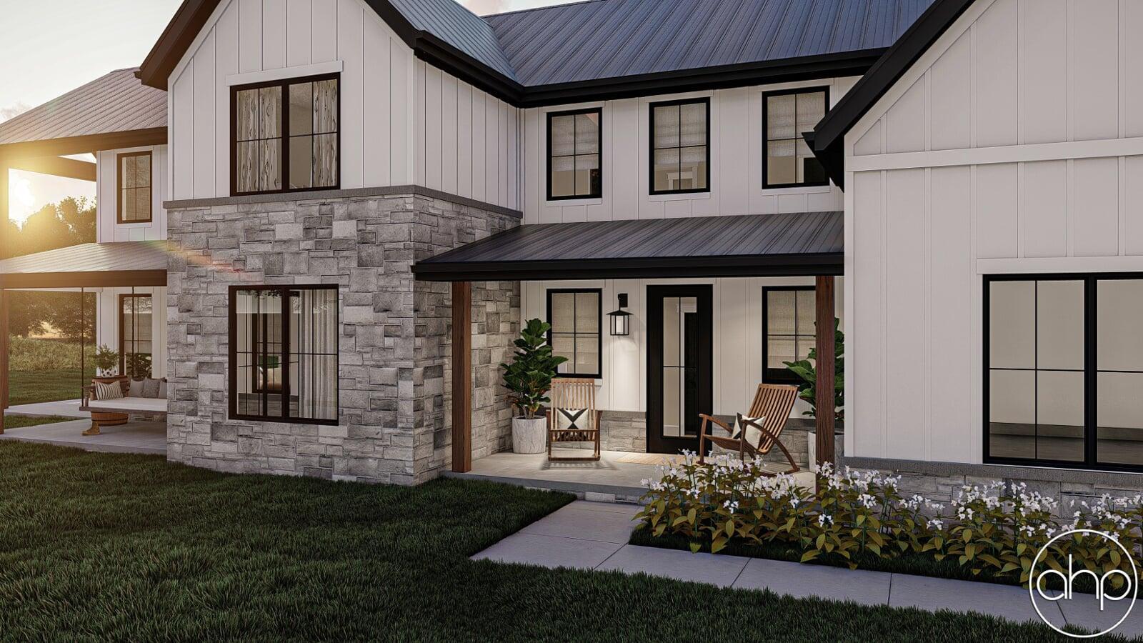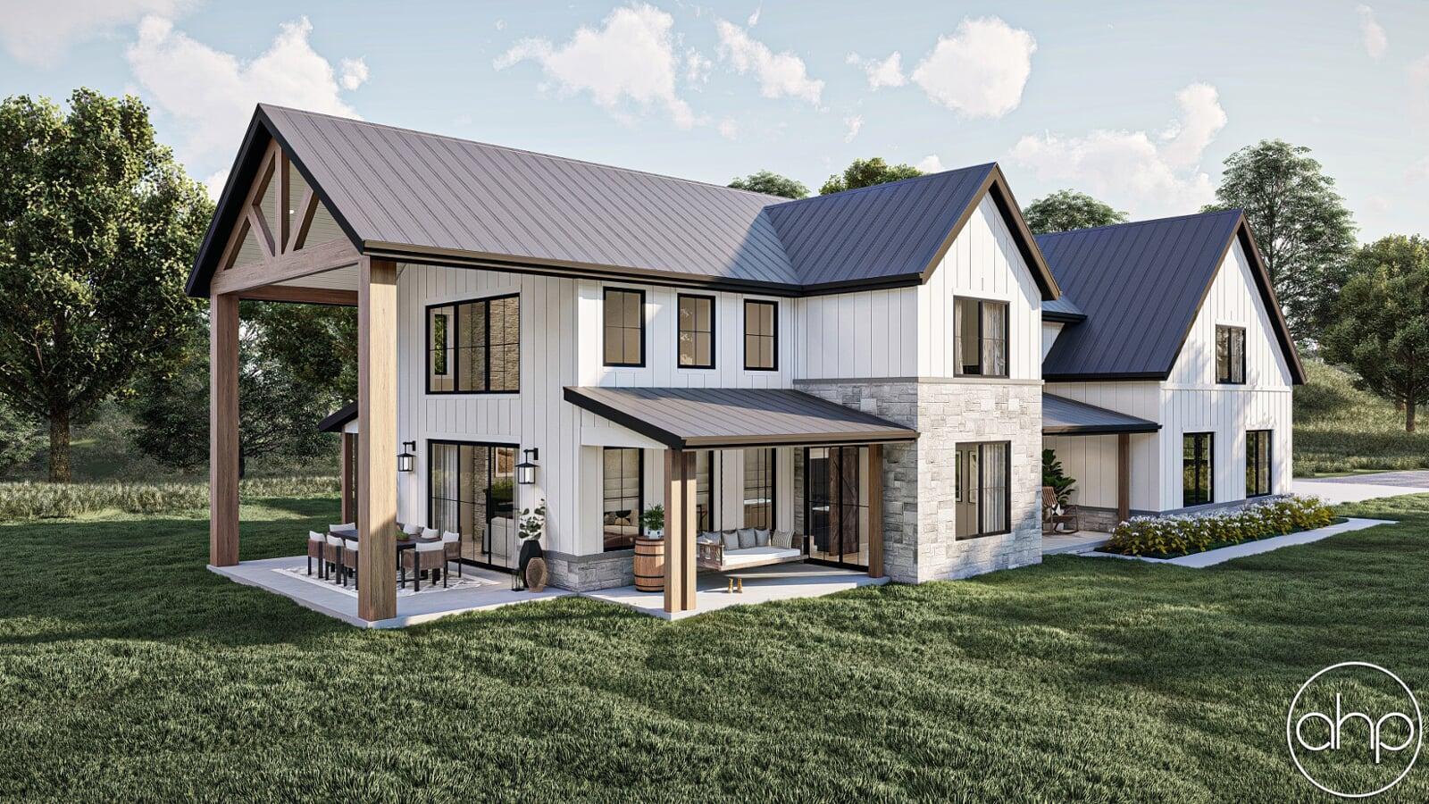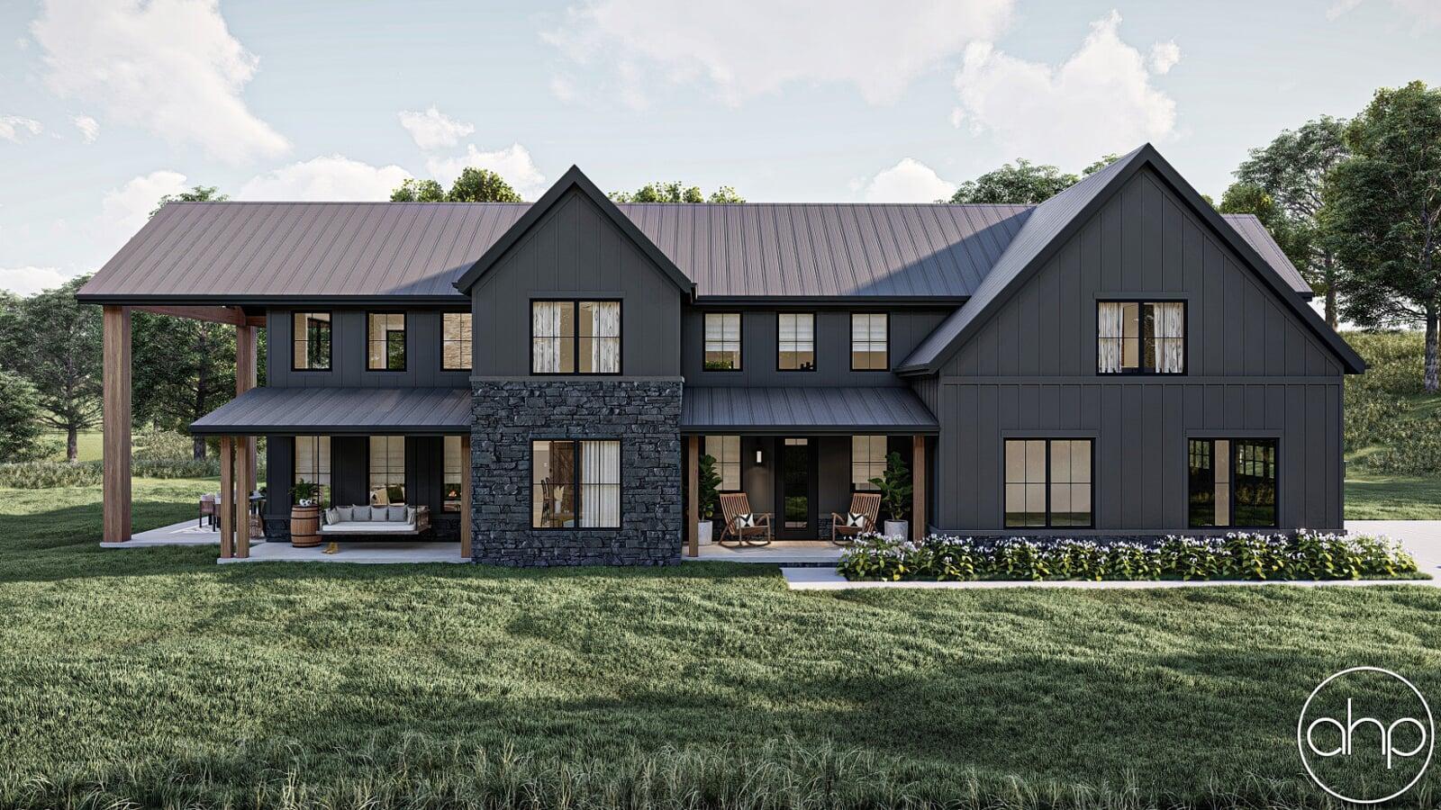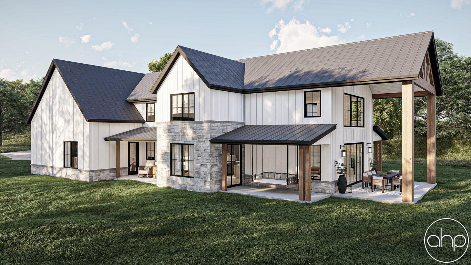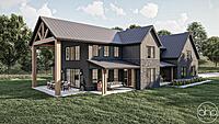 This Barndominium style house plan boasts 3767 square feet, 4 bedrooms, and 5 bathrooms. The exterior of the home has a gorgeous contrast of stone, board and batten siding, as well as wood and dark metal accents, giving a gorgeous modern farmhouse turned barndominium.