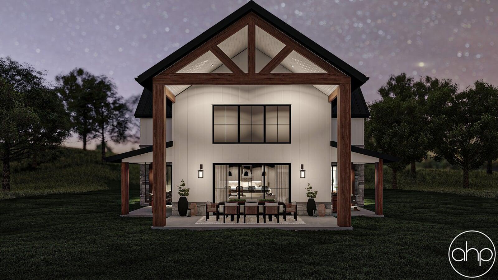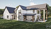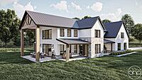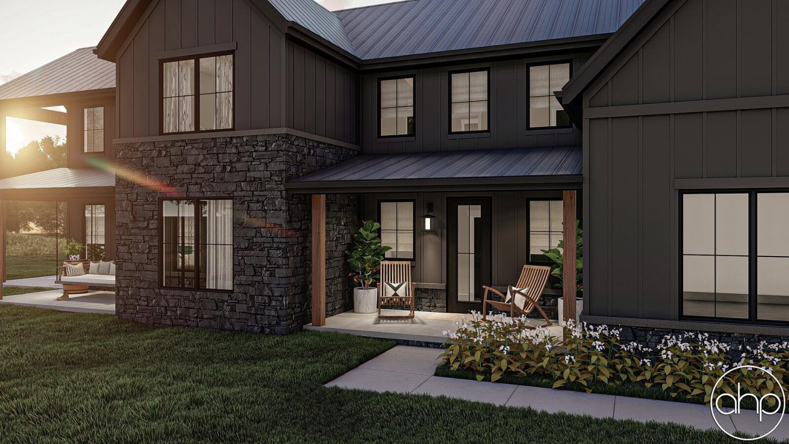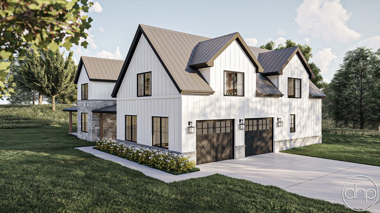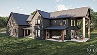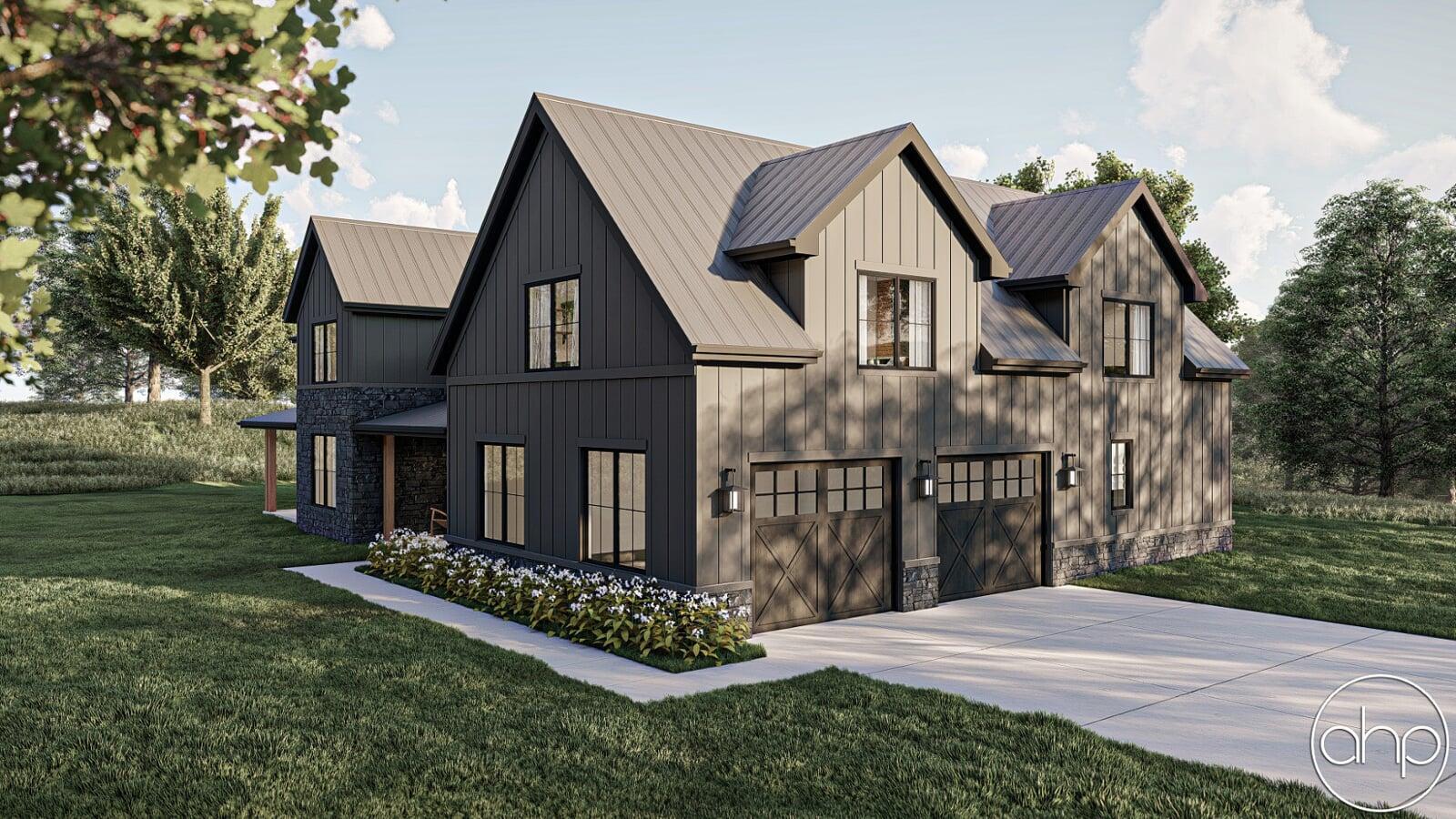 This Barndominium style house plan boasts 3767 square feet, 4 bedrooms, and 5 bathrooms. The exterior of the home has a gorgeous contrast of stone, board and batten siding, as well as wood and dark metal accents, giving a gorgeous modern farmhouse turned barndominium.