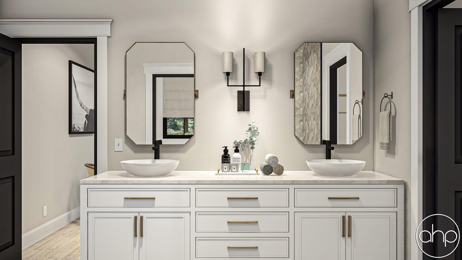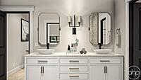 Around the corner is where a powder bath, laundry room, and master suite can be found. This includes a large walk-in closet as well as a private bathroom with double vanities and separate shower and toilet areas.