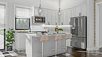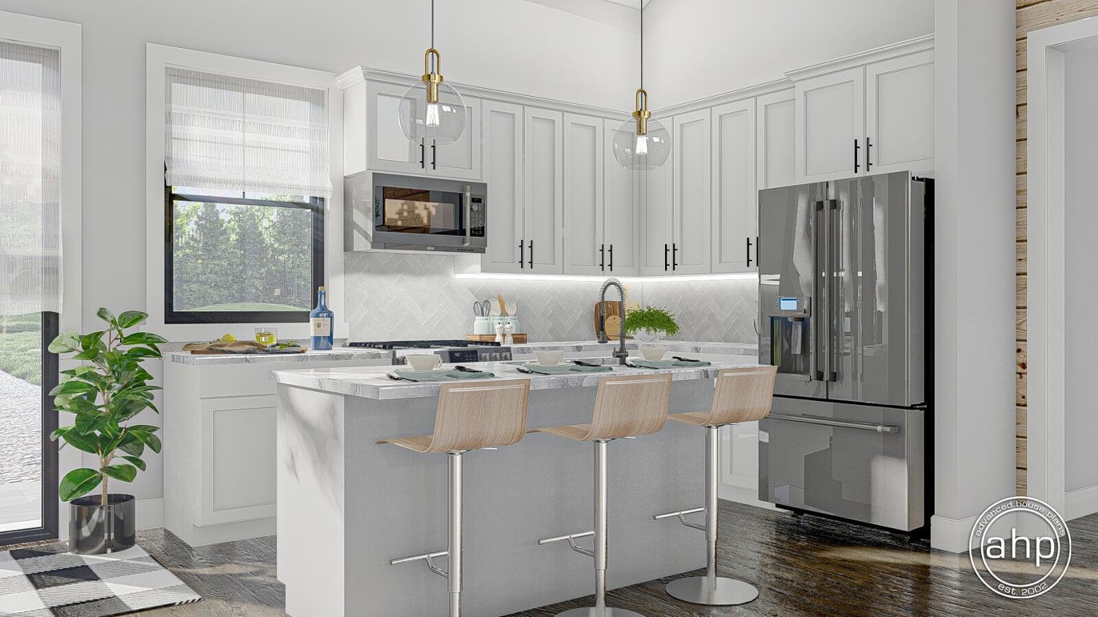 Just inside the Barndominium home, you'll notice the wide-open floor plan. The kitchen, dining room, and family room lie under a soaring cathedral ceiling, making the space feel huge. The family room is warmed by a fireplace that is flanked by built-in bookshelves. The kitchen includes an island with a snack bar.
