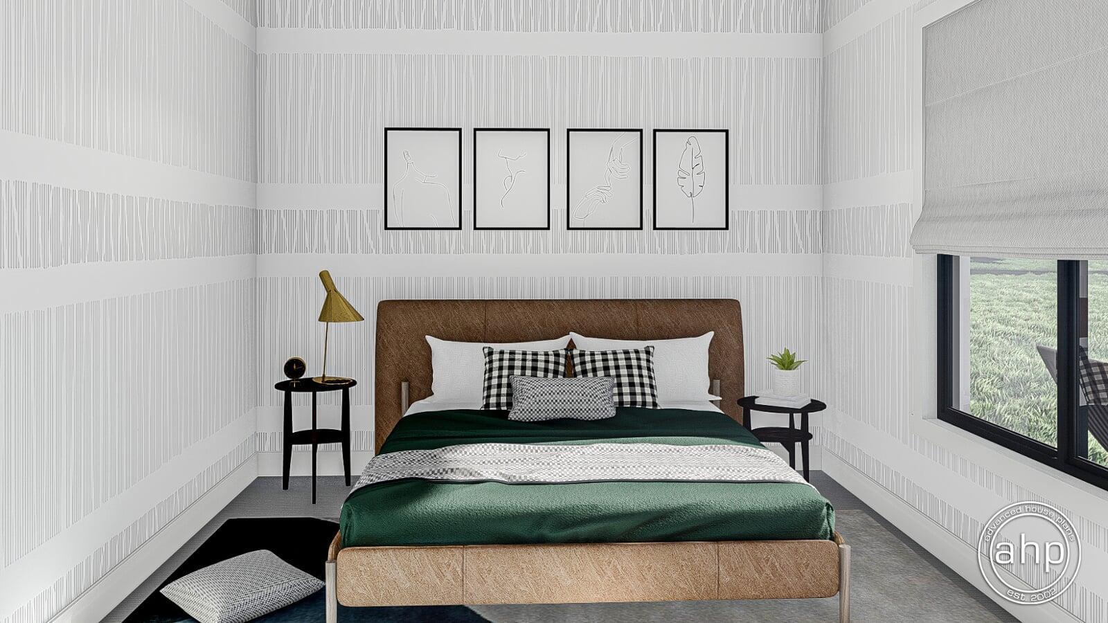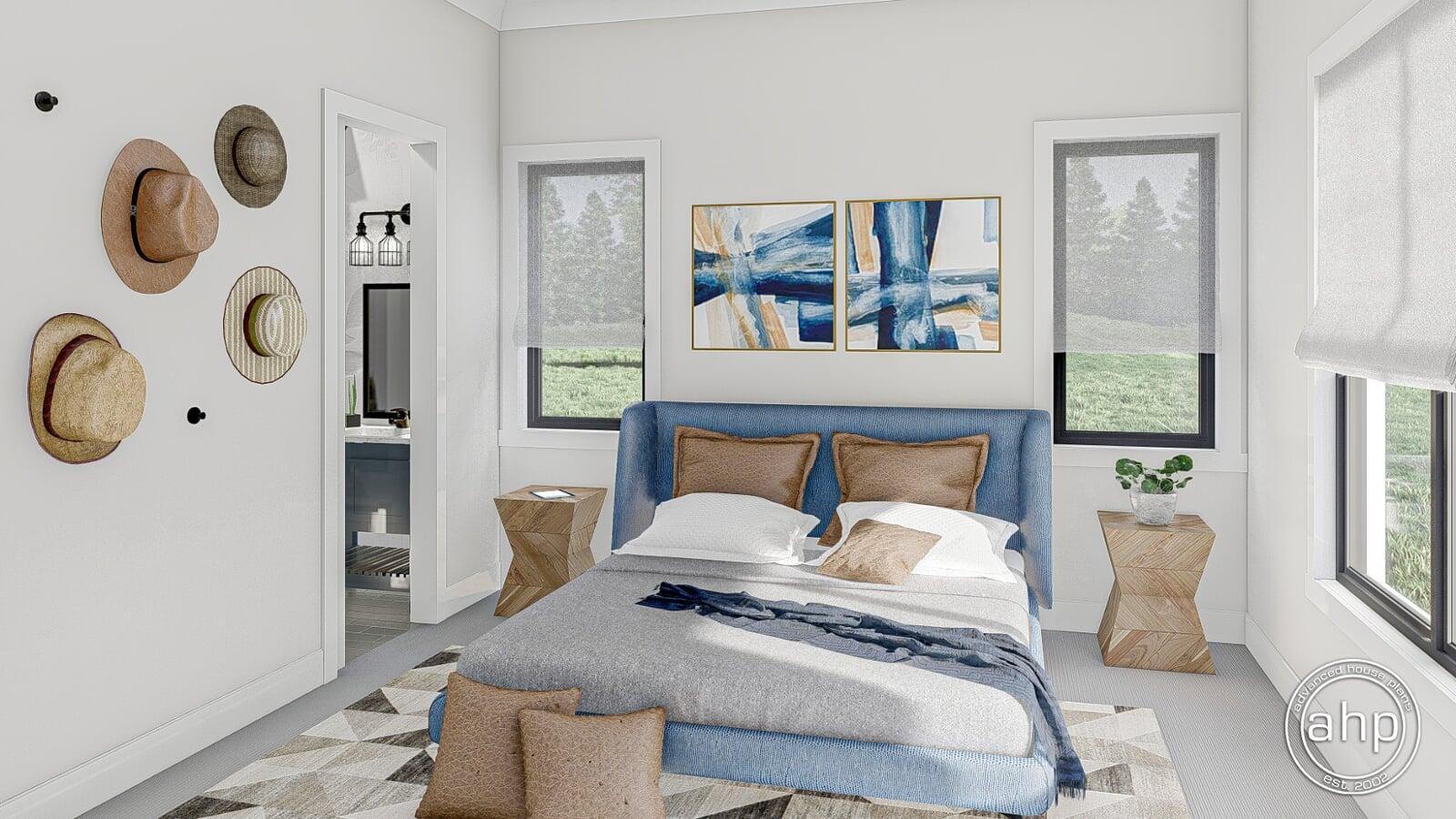 The right side of the Barndominium home features 2 bedrooms and a centrally located hall bathroom with dual vanities.