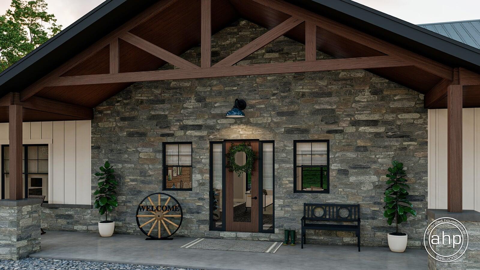 The exterior has rustic charm with its combination of stone, wood beams, metal roof, and board and batten siding. A large front covered porch with a cathedral ceiling invites guests into the home.