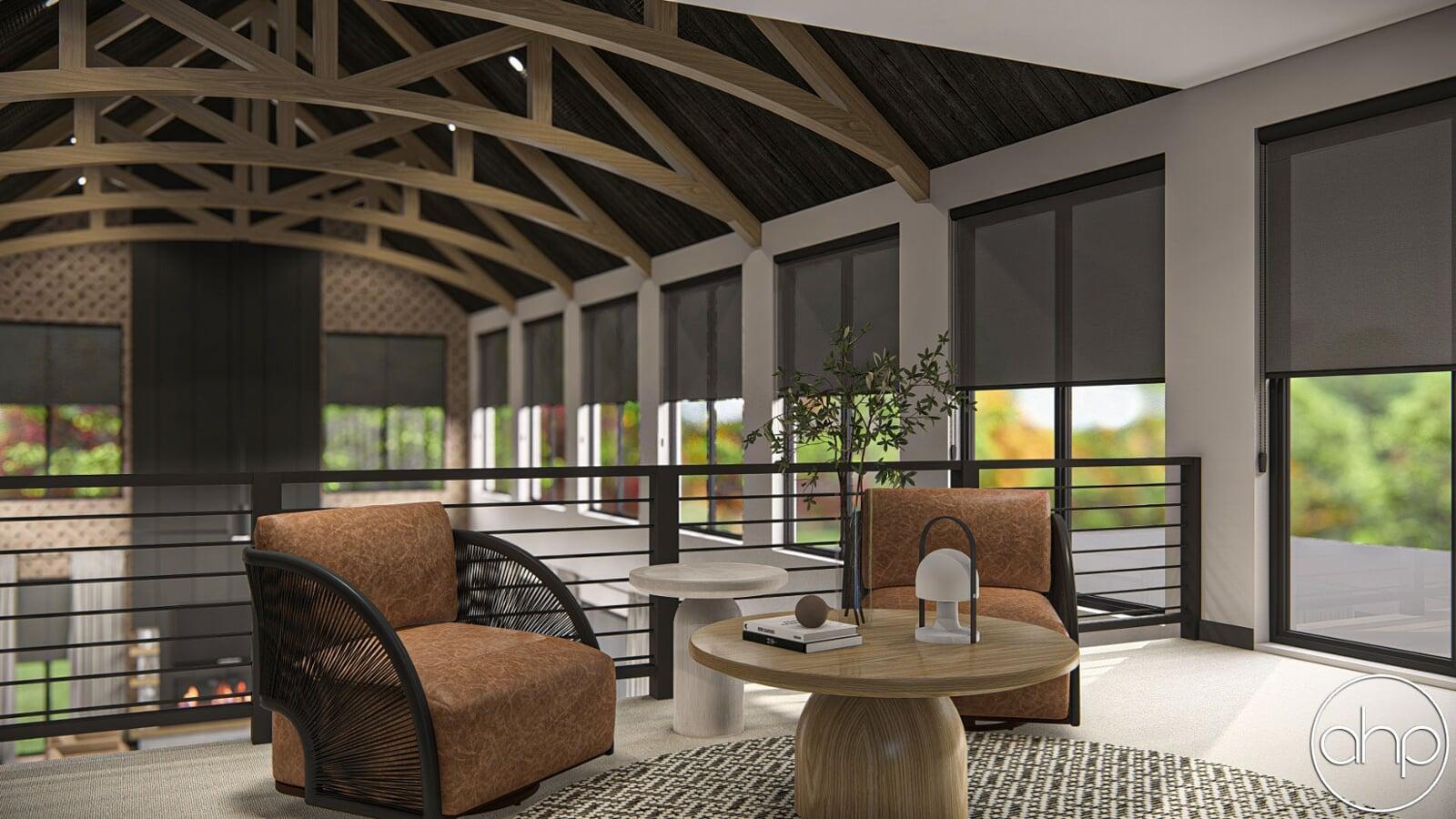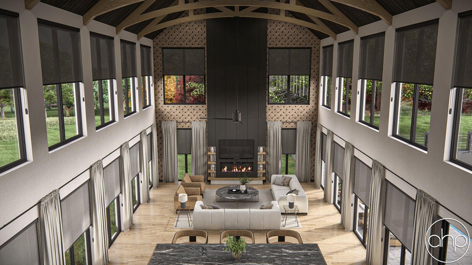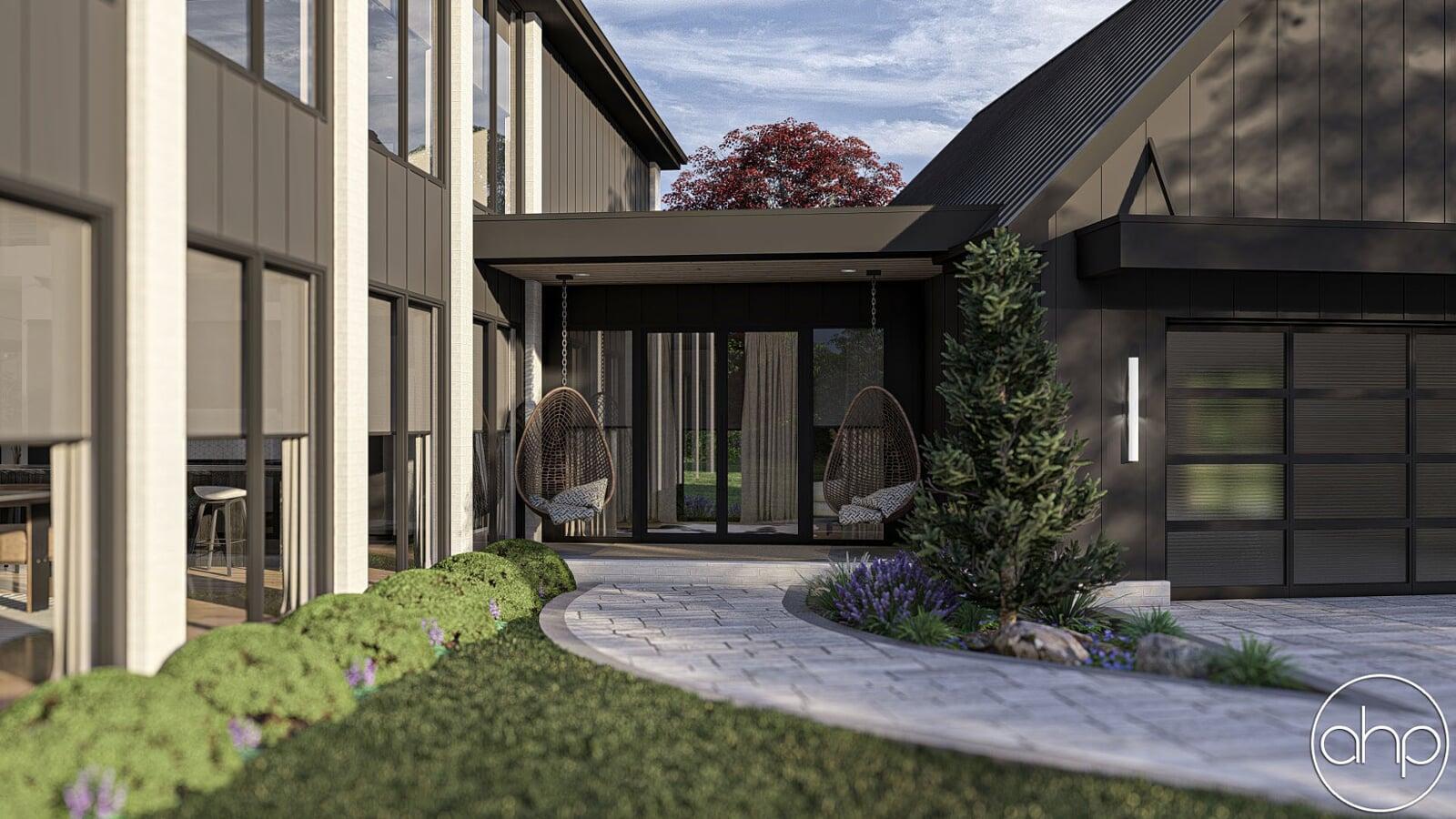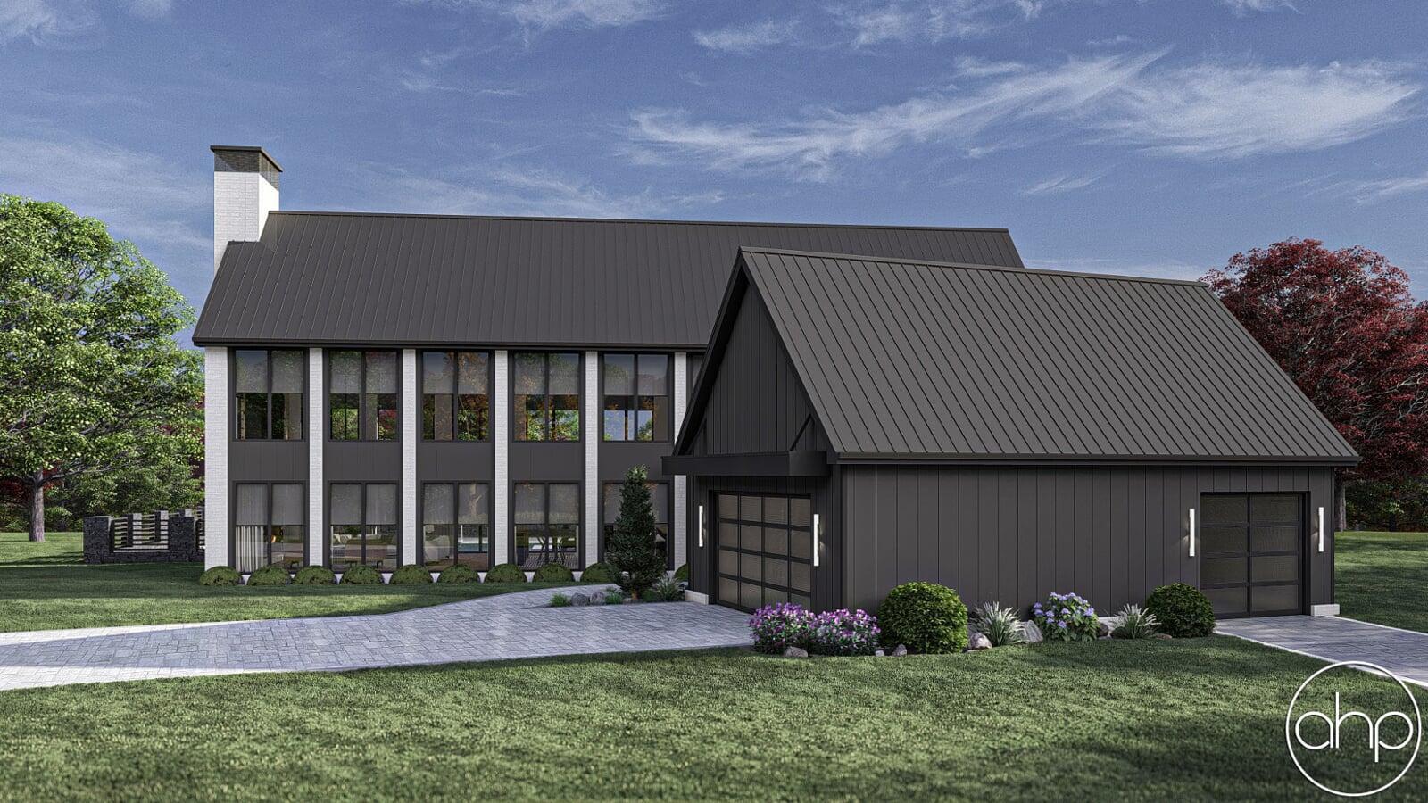 The exterior facade boasts a striking blend of sleek lines and rustic elements. The structure is characterized by a mixture of board and batten and brick siding, giving it a contemporary twist on the classic barn aesthetic. Large windows wrap around the entirety of the home, inviting ample natural light and panoramic views of the surrounding landscape. A covered porch provides a welcoming entrance and a cozy spot to enjoy the outdoors.