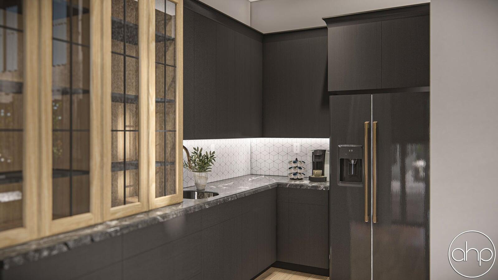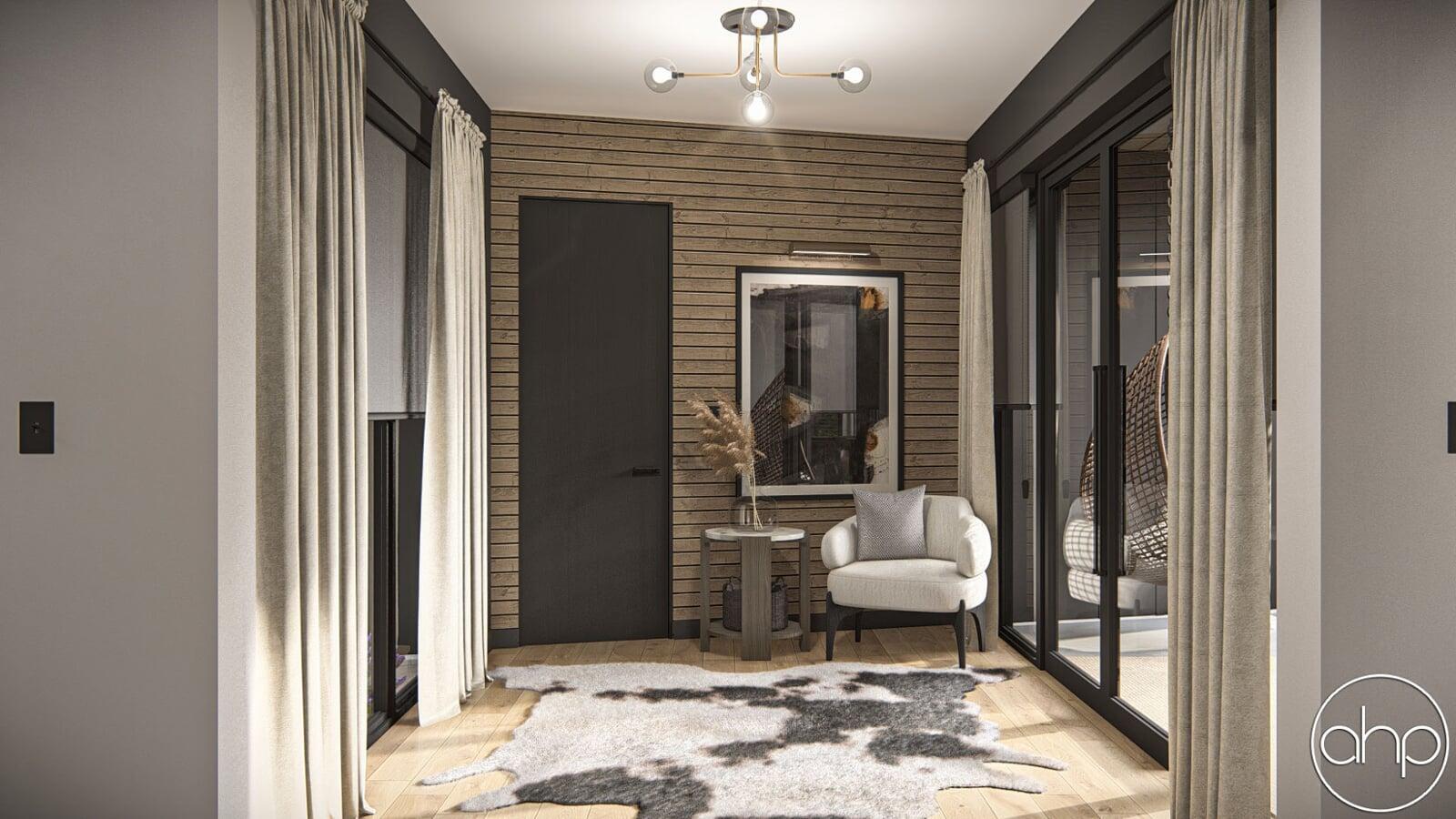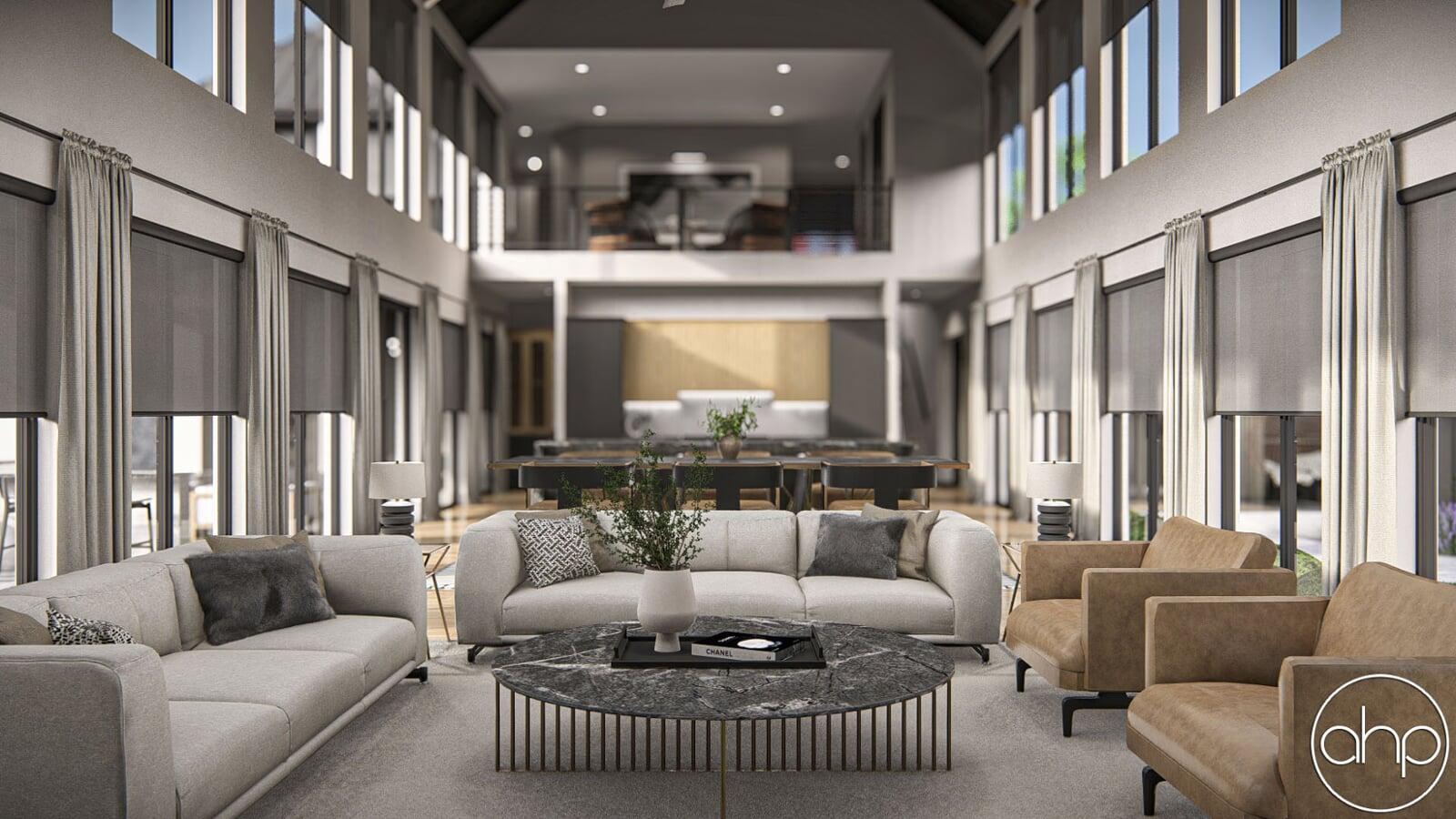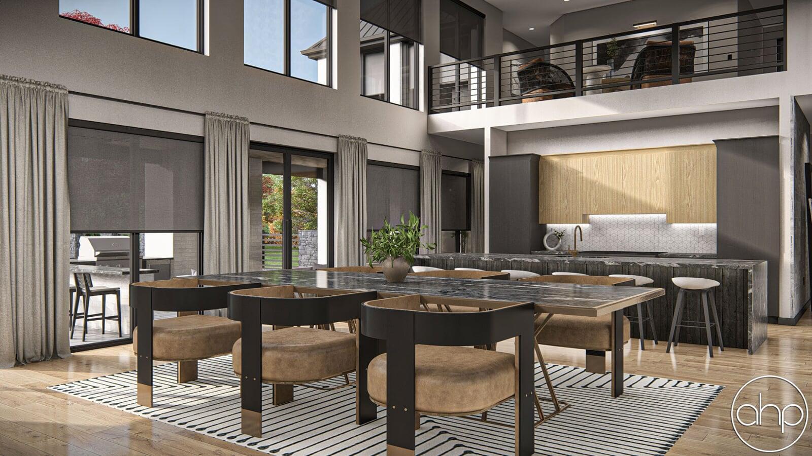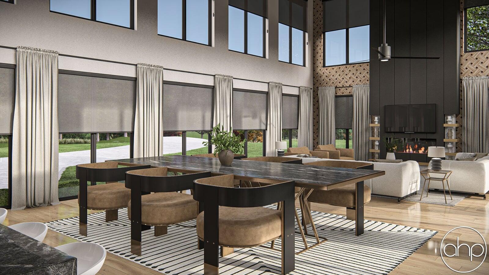The exterior facade boasts a striking blend of sleek lines and rustic elements. The structure is characterized by a mixture of board and batten and brick siding, giving it a contemporary twist on the classic barn aesthetic. Large windows wrap around the entirety of the home, inviting ample natural light and panoramic views of the surrounding landscape. A covered porch provides a welcoming entrance and a cozy spot to enjoy the outdoors.
