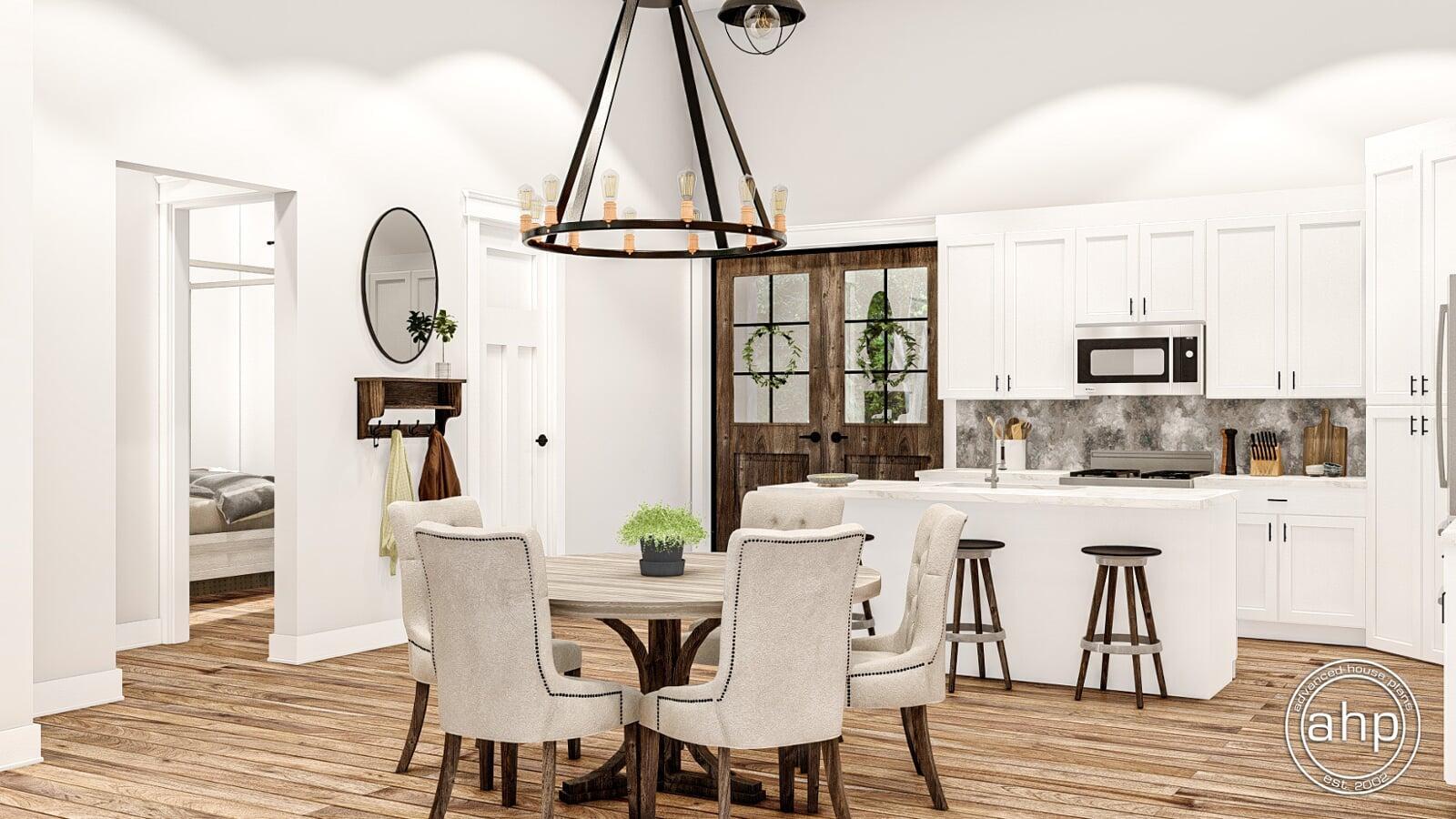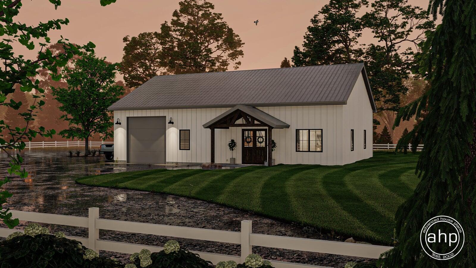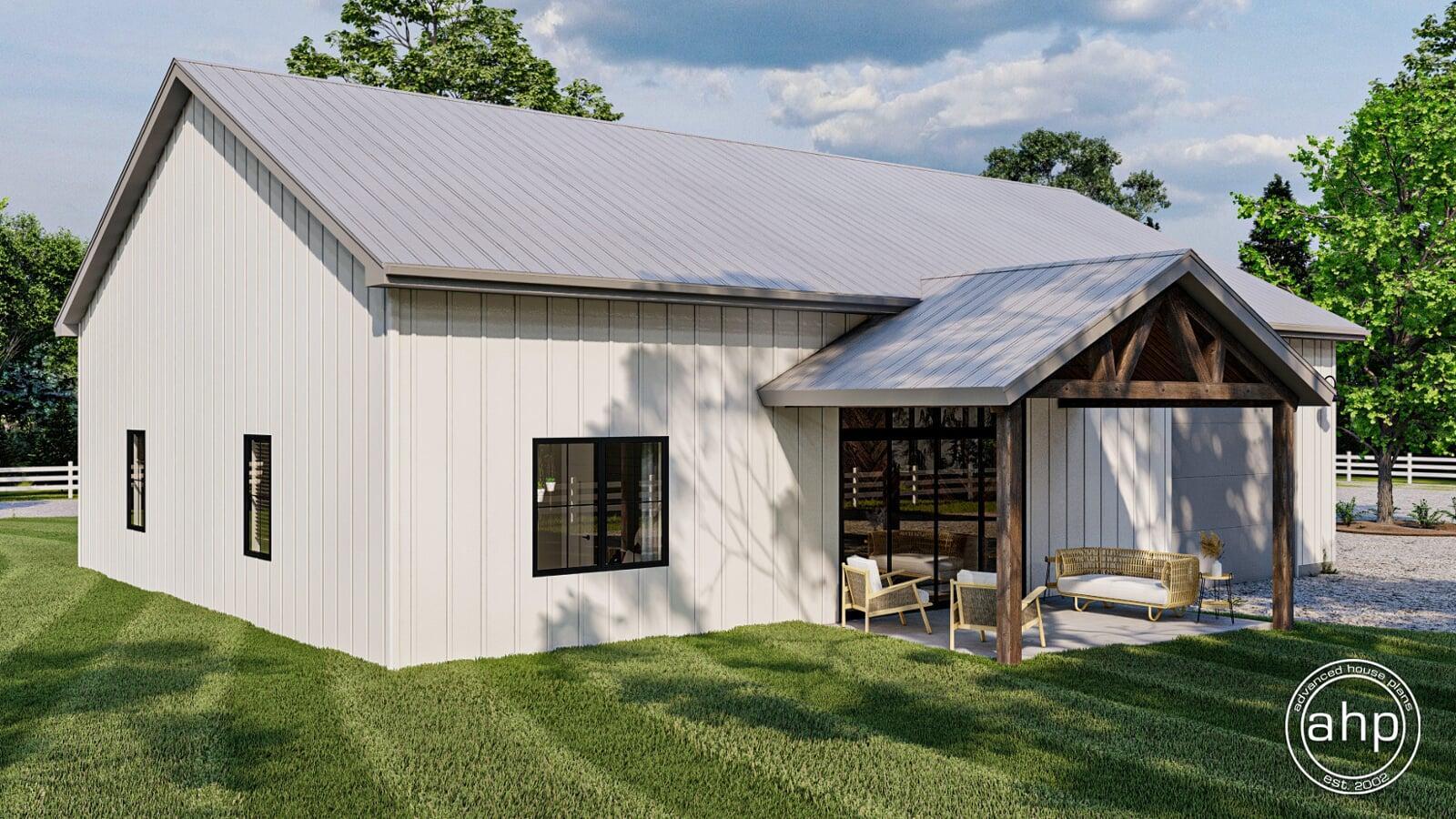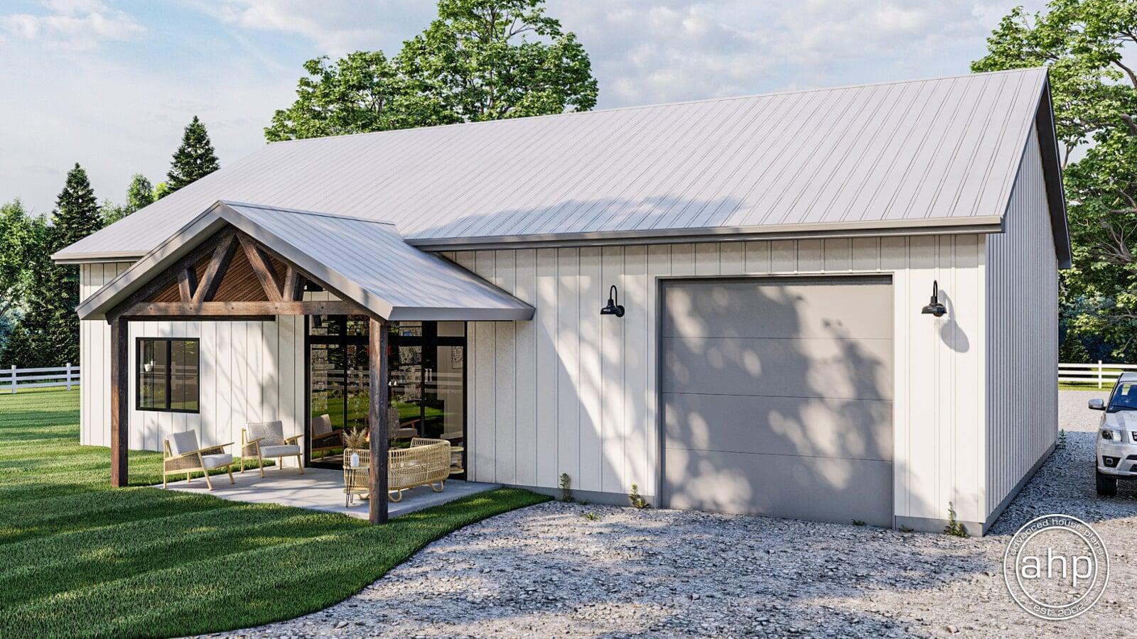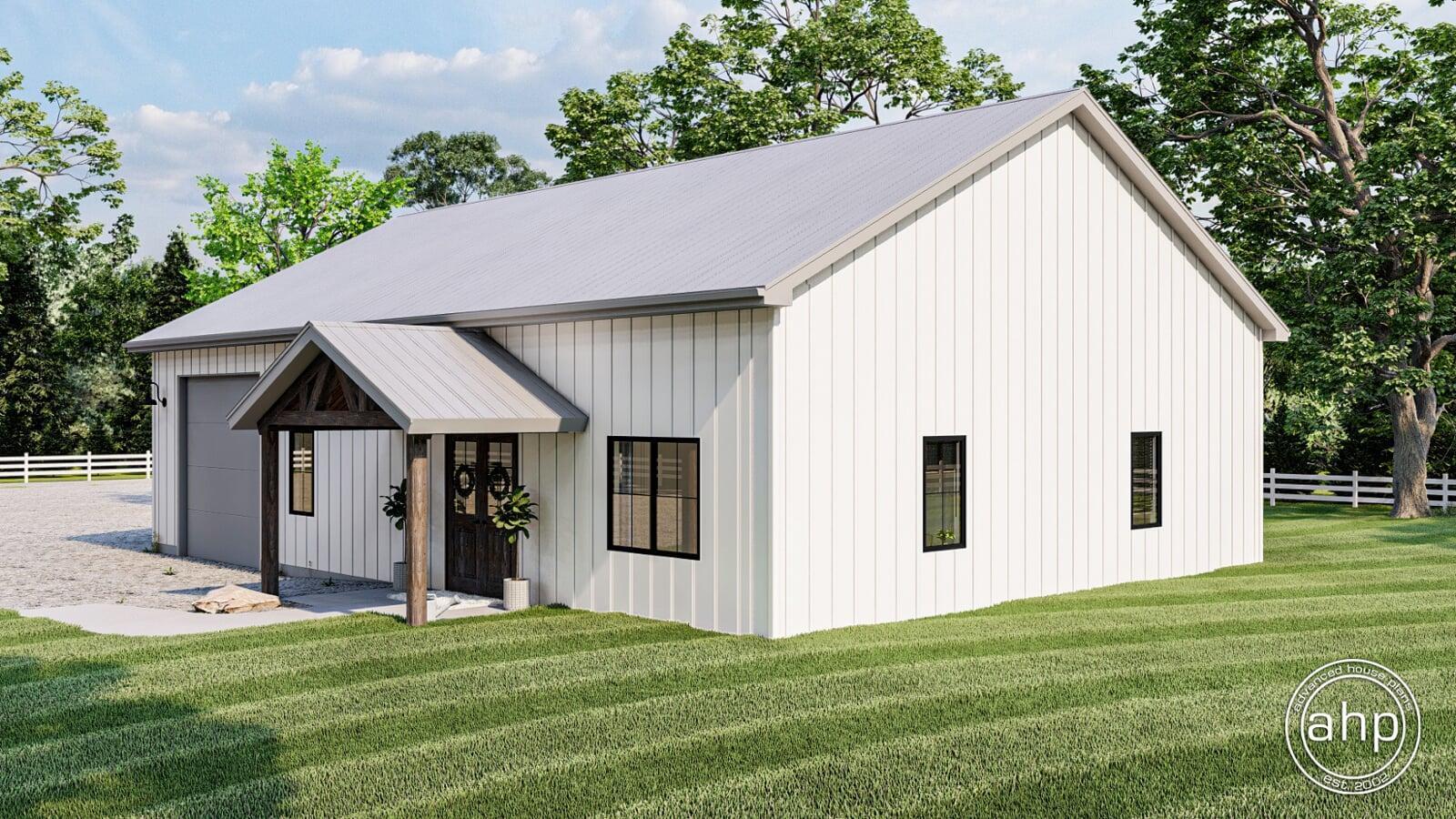 If you've been thinking about building a barndominium, the Mead Farm may be the perfect home for you. At just over 1400 sq. ft., this plan is affordable to build. Just because it's affordable, doesn't mean it doesn't look amazing. The exterior combines the modern farmhouse style with its simple footprint.