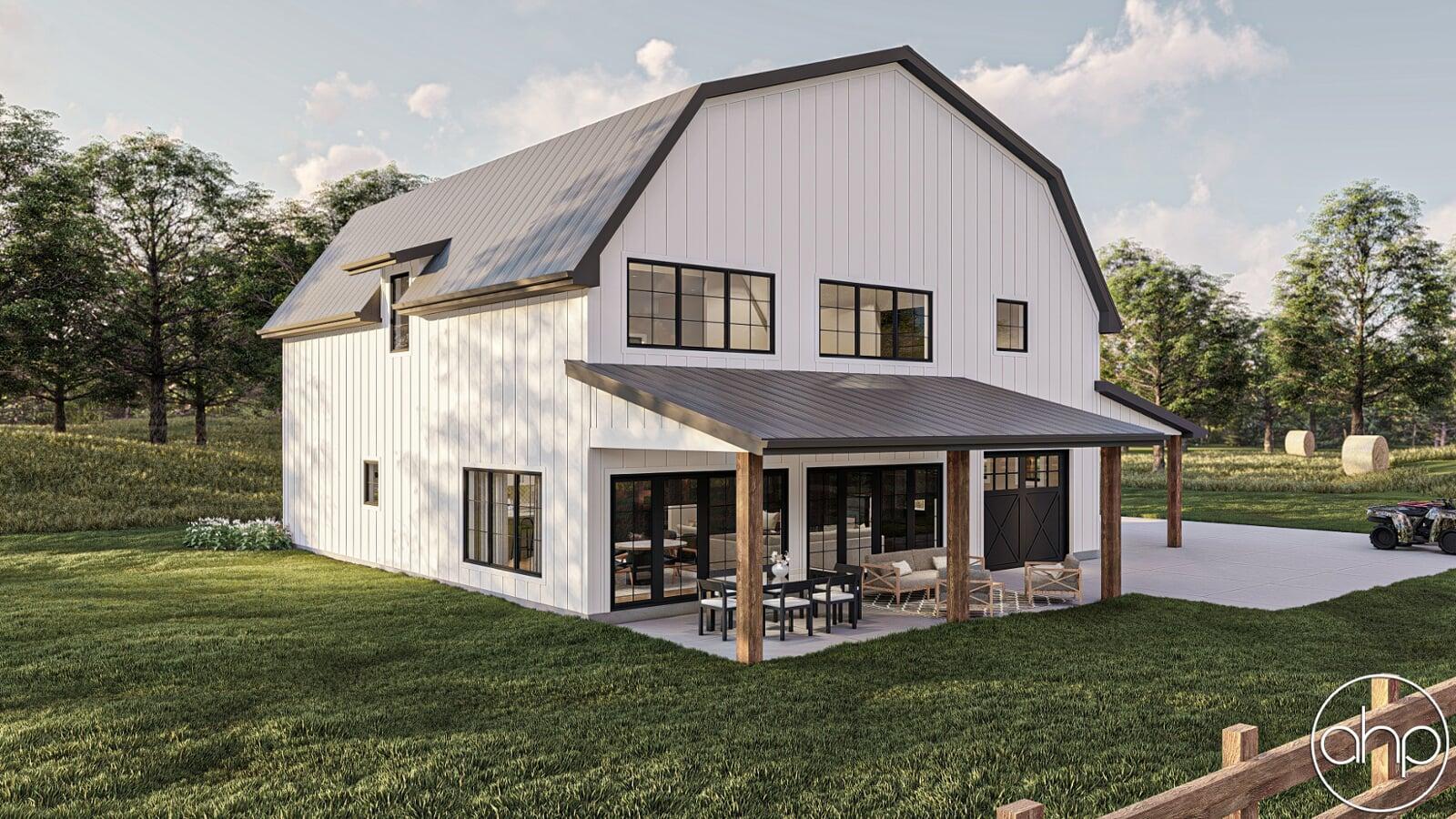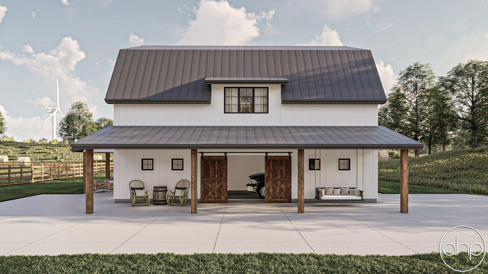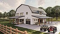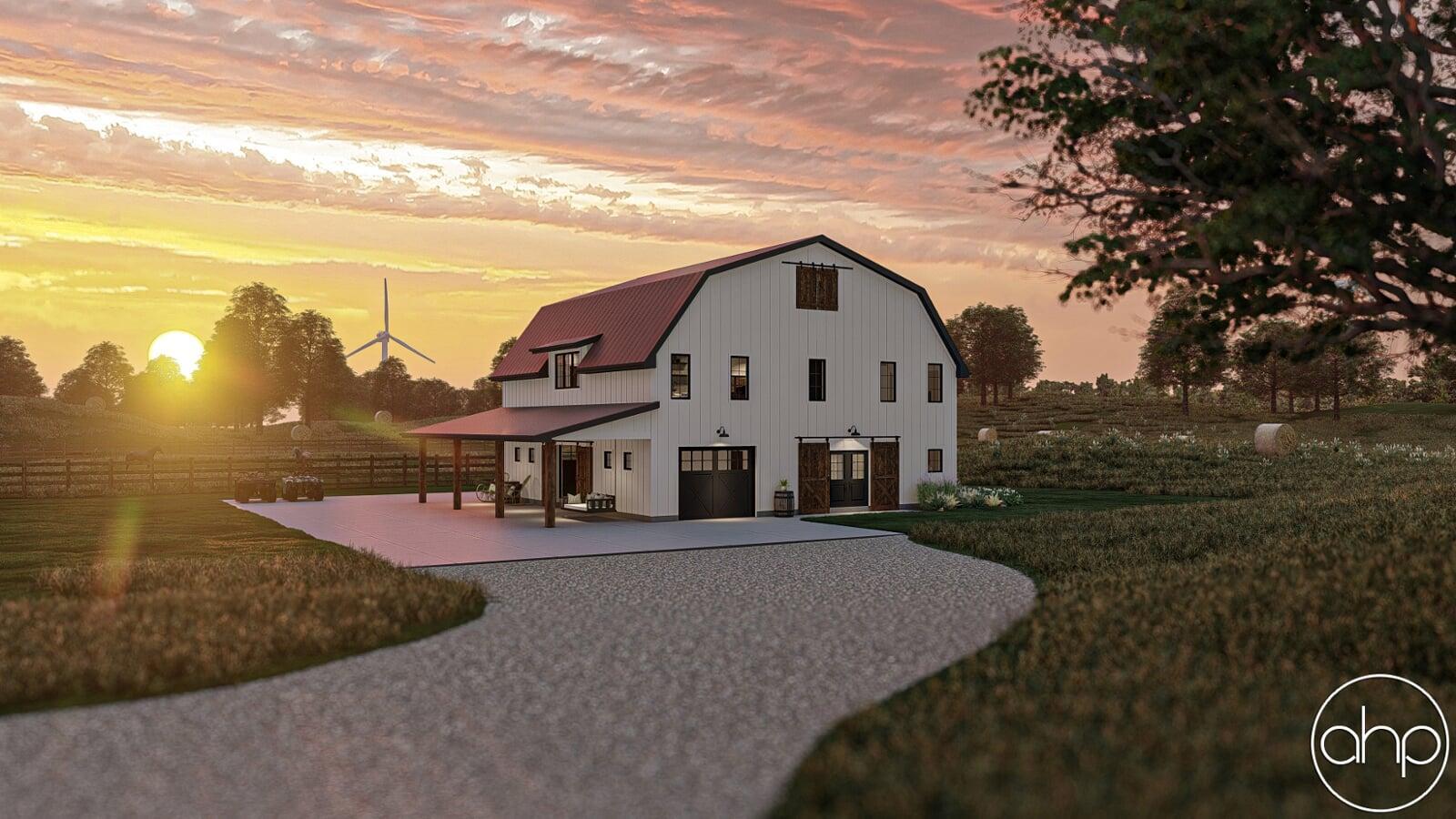 Introducing the captivating Barndominium House Plan, where rustic charm meets modern convenience. This remarkable residence seamlessly combines the classic barn aesthetic with the comfort and style of a contemporary home. The exterior boasts a distinctive barn-shaped roof that adds character and visual appeal to the structure. To enhance outdoor living, a delightful lean-to covered patio stretches invitingly from the side, providing a cozy space to relax and entertain.