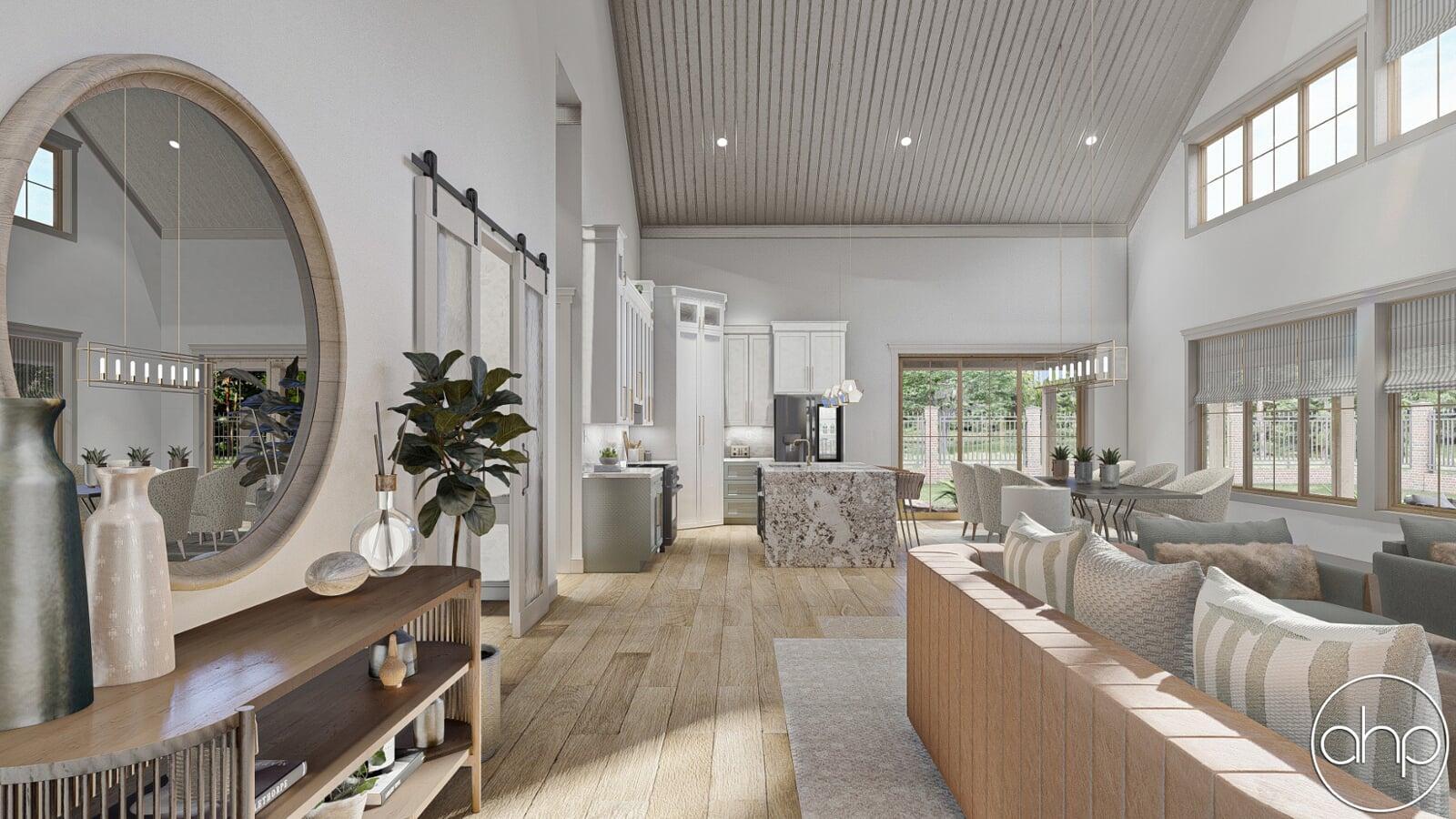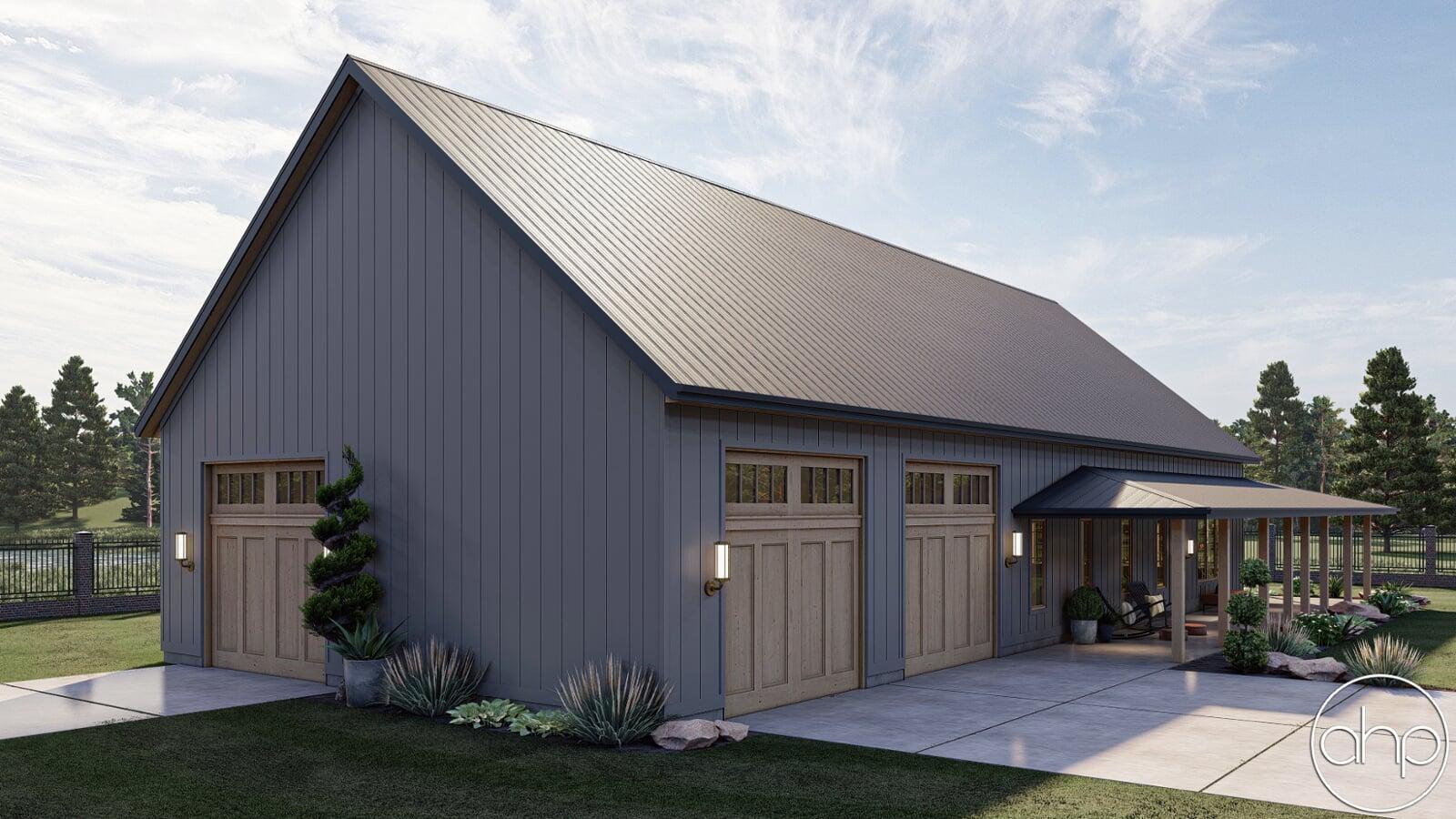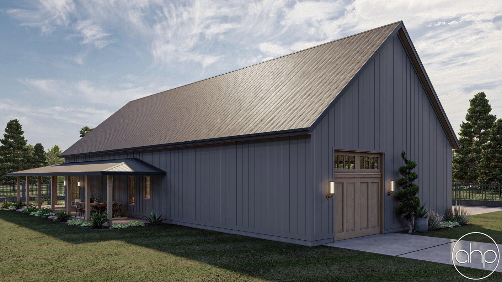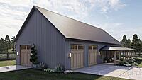 The Red Rocks plan is a stunning Barndominium style 1 story house plan. The simple shape of the exterior makes the plan very efficient to build. A wrap around porch creates a ton of outside entertainment space.