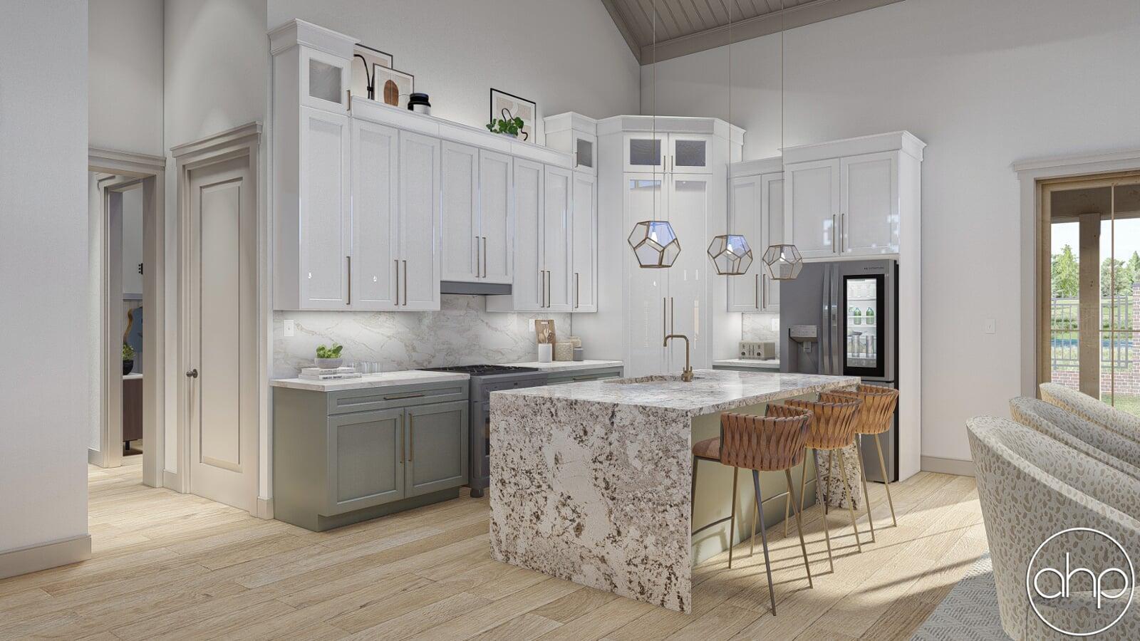 Just inside the home, you'll notice a wide-open floor plan with a soaring cathedral ceiling and 14' high walls. The great room is warmed by a beautiful corner fireplace. The kitchen includes a large walk-in pantry and an island with a snack bar. An office can be found right off the main living space.