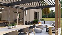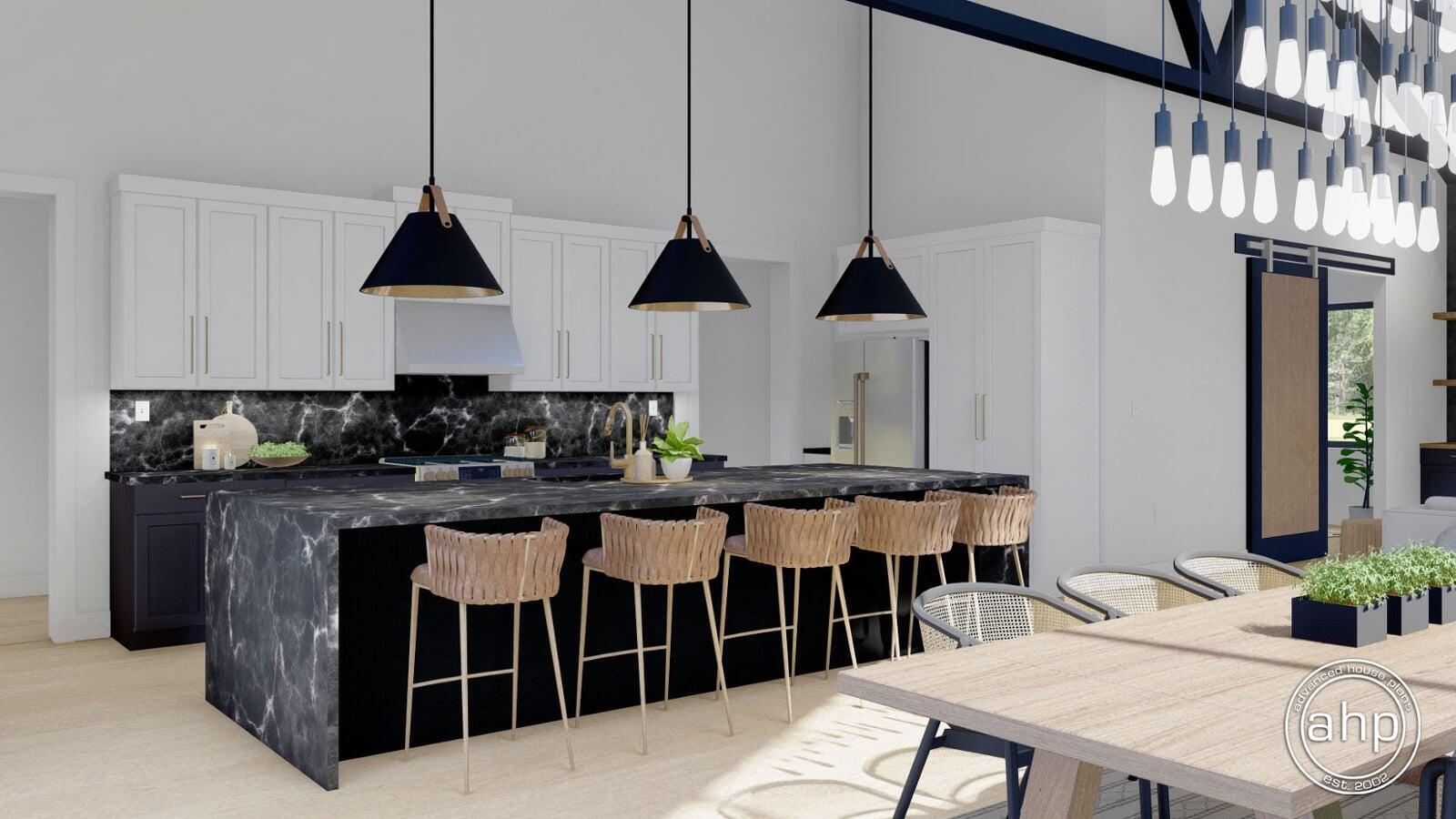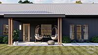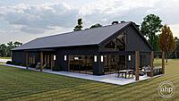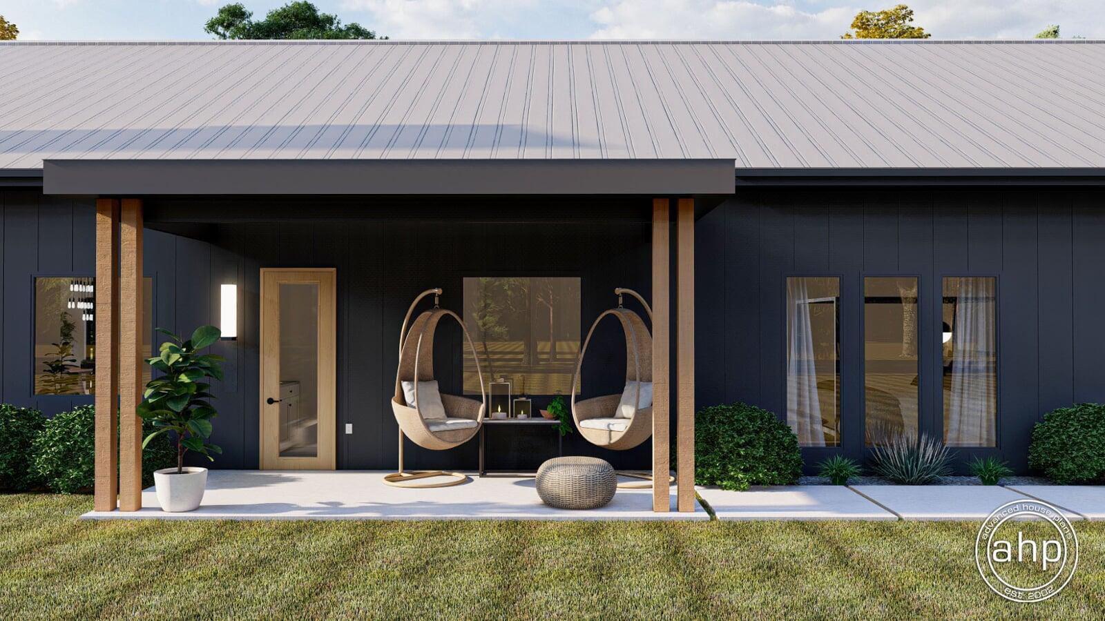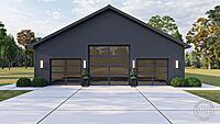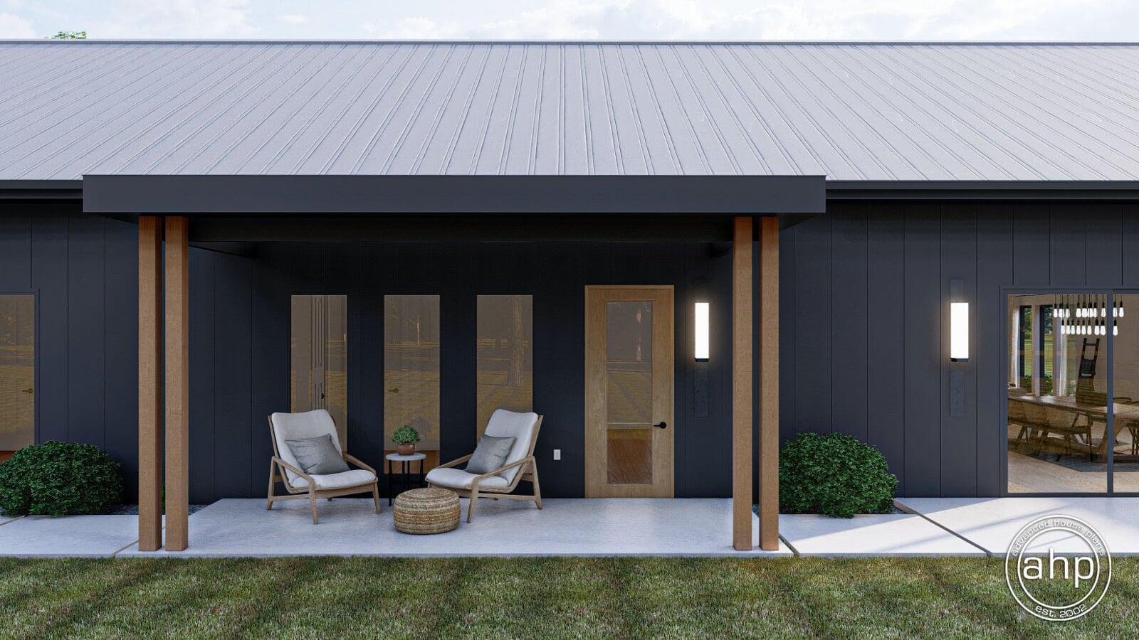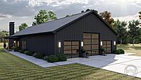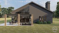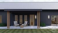 The Round Rock plan is a beautiful Modern Farmhouse Barndominium. The exterior of the home is highlighted by dark board and batten siding, a standing seam metal roof, and a large pergola.