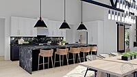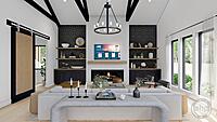 The Barndominium main living area is arranged beautifully in an open layout. The entire home feels massive due to its 12' wall height. The great room, dining room, and kitchen all lie under a soaring cathedral ceiling with exposed beams. The great room is warmed by a fireplace that is flanked by built-in bookshelves. A home office is located off the great room and includes a built-in desk.
