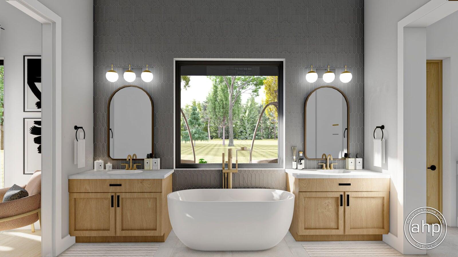 The master suite is located on the left side of the Barndominium home and features a decorative trayed ceiling. The master bathroom includes a soaking tub, his/her vanities, an enclosed toilet area, and a walk-in shower. A coffee bar leads from the master suite to a private covered patio on the rear of the home.
