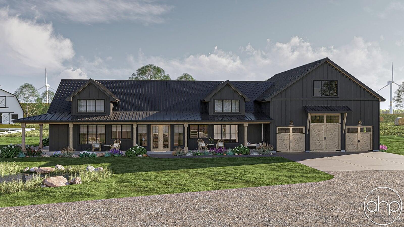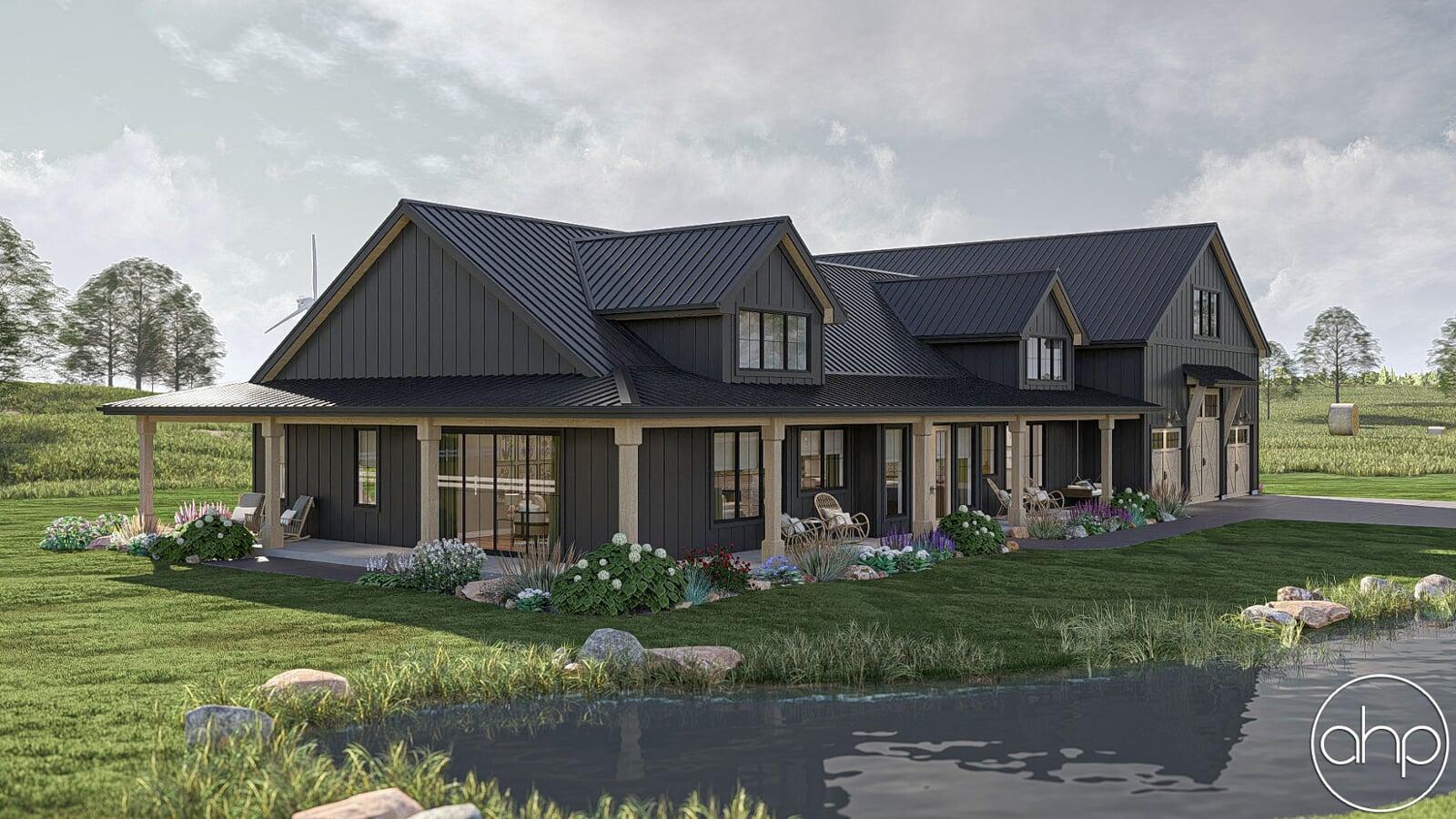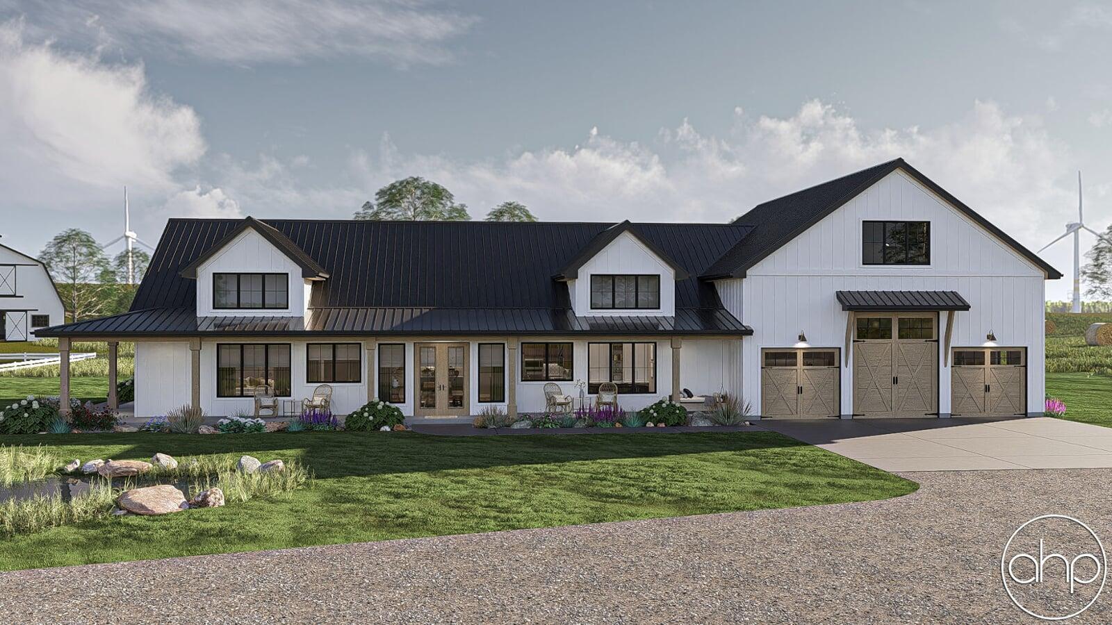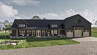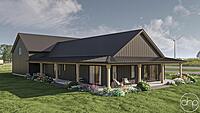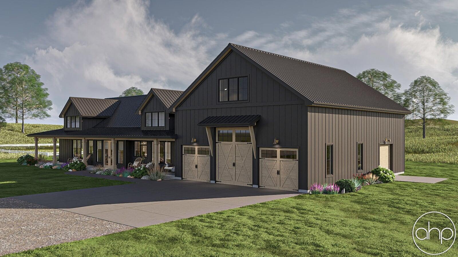 This single-story barndominium-style house plan combines rustic charm with modern functionality. The exterior features classic board-and-batten siding complemented by steel panel roofing and wood accents, giving it a cozy yet durable feel. A massive wrap-around porch encircles the home, perfect for outdoor living and relaxation. The front of the home includes a three-car garage with a spacious workshop, and above the garage, an upstairs loft serves as a lounge area overlooking the entire garage space.