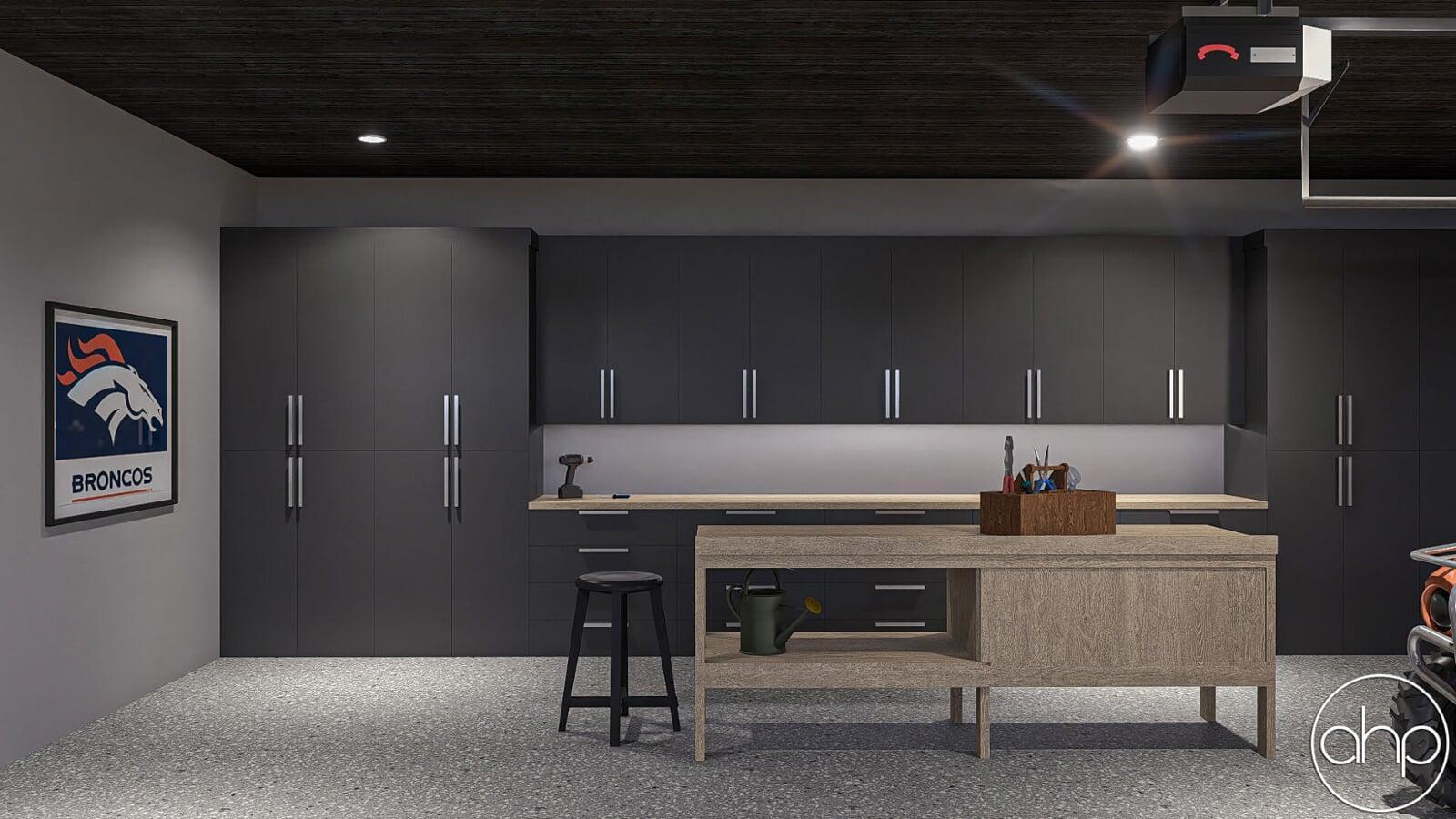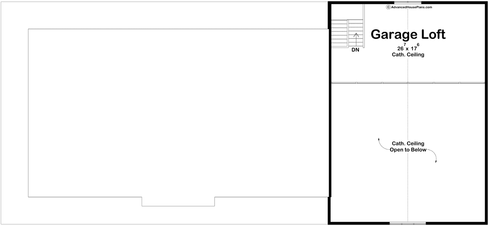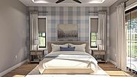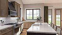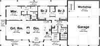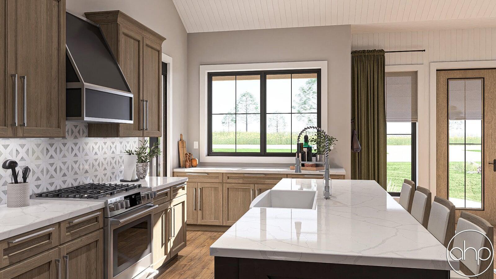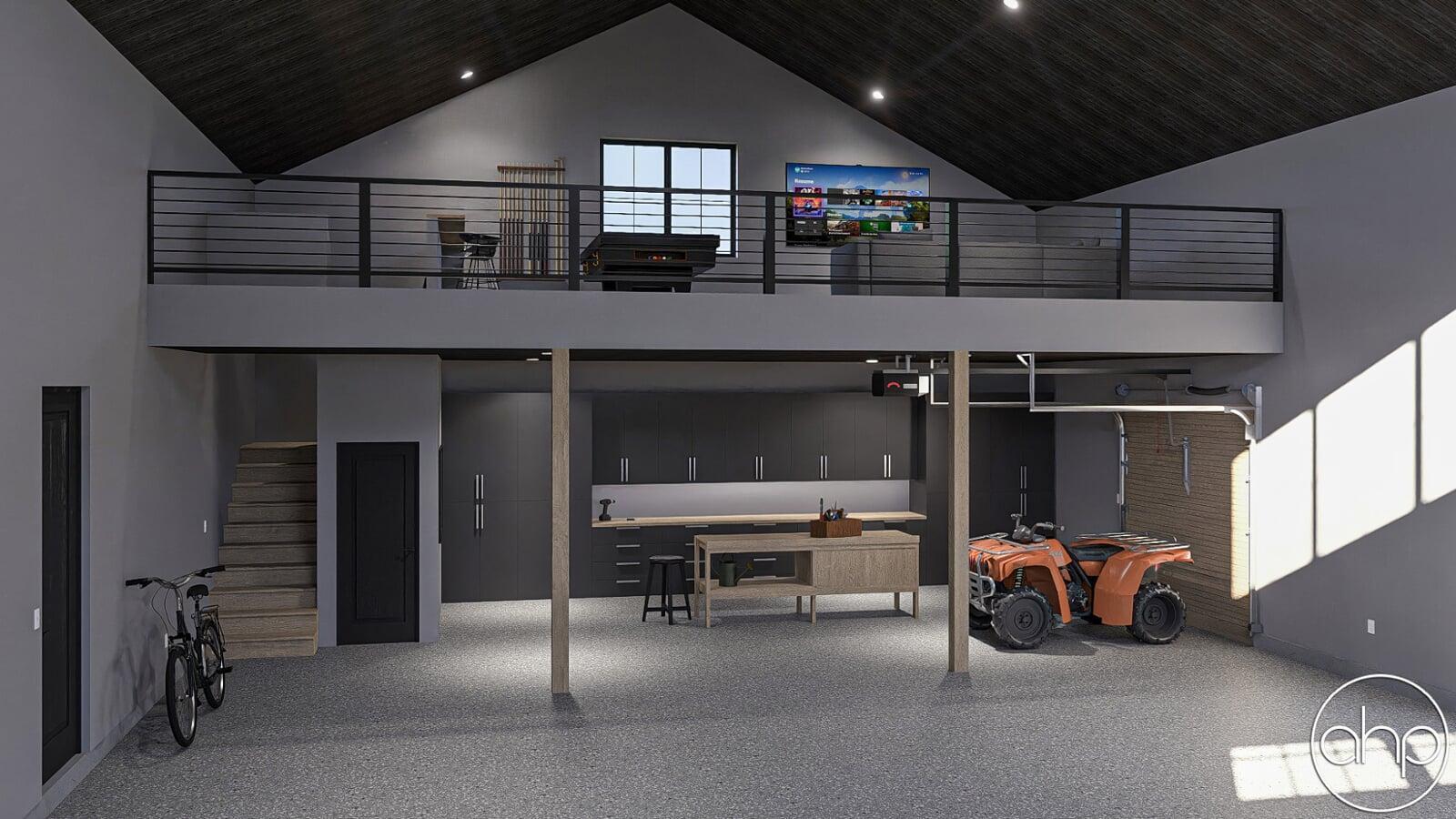 This single-story barndominium-style house plan combines rustic charm with modern functionality. The exterior features classic board-and-batten siding complemented by steel panel roofing and wood accents, giving it a cozy yet durable feel. A massive wrap-around porch encircles the home, perfect for outdoor living and relaxation. The front of the home includes a three-car garage with a spacious workshop, and above the garage, an upstairs loft serves as a lounge area overlooking the entire garage space.