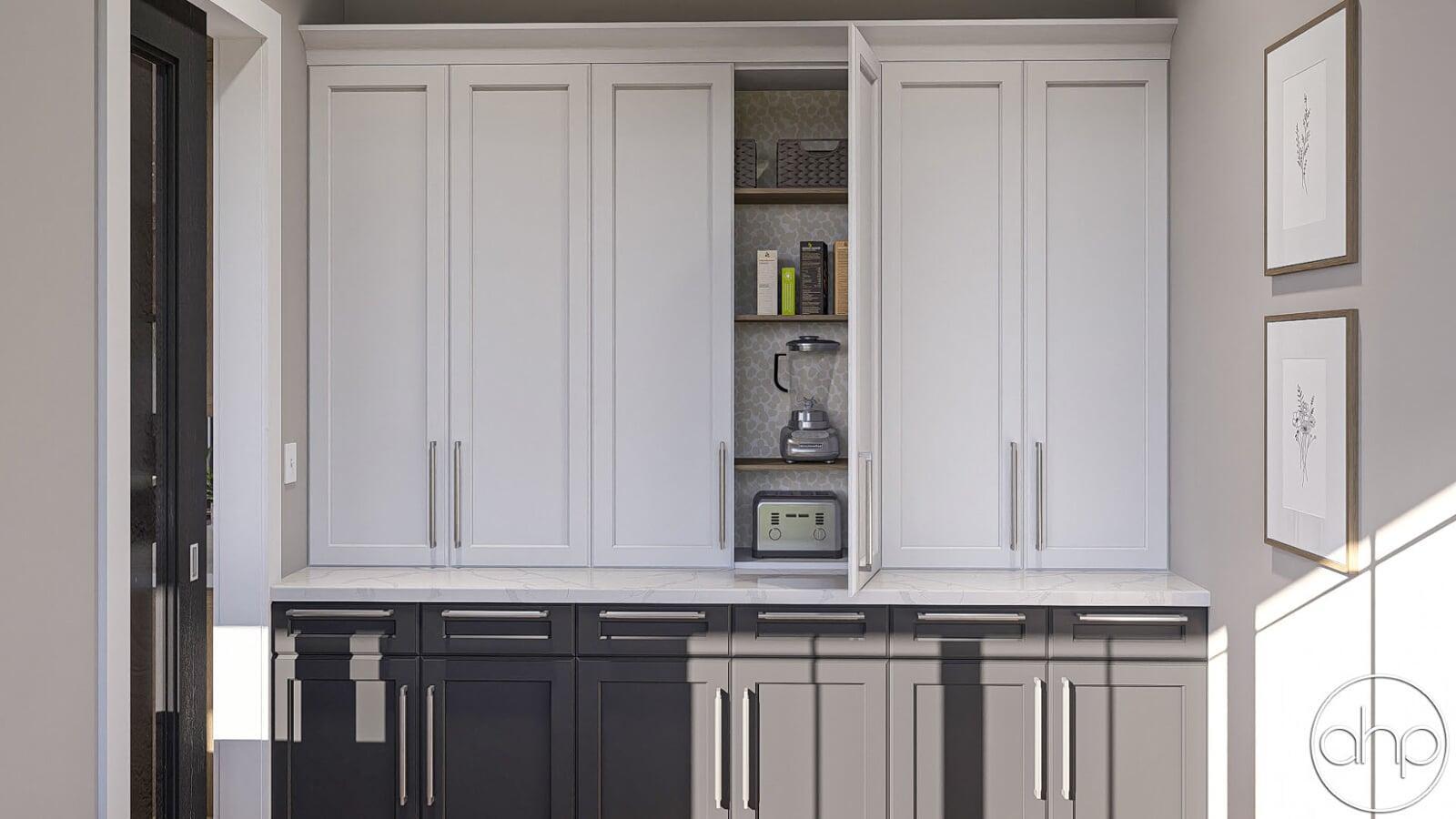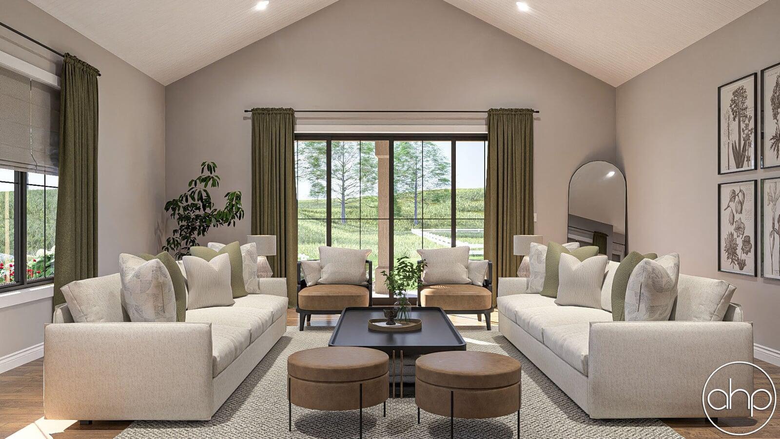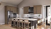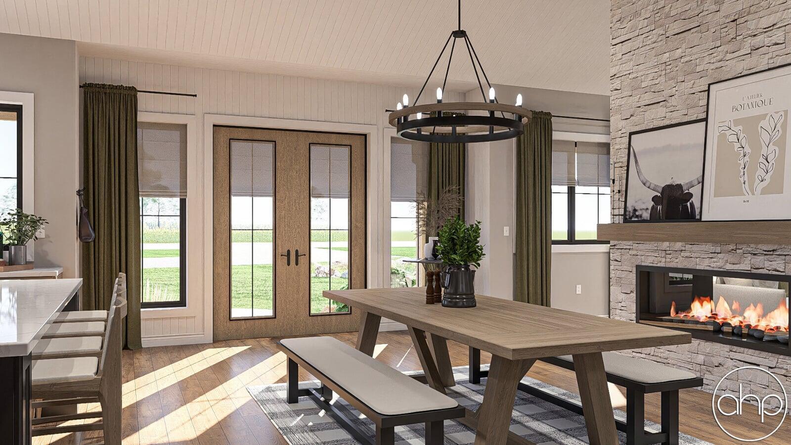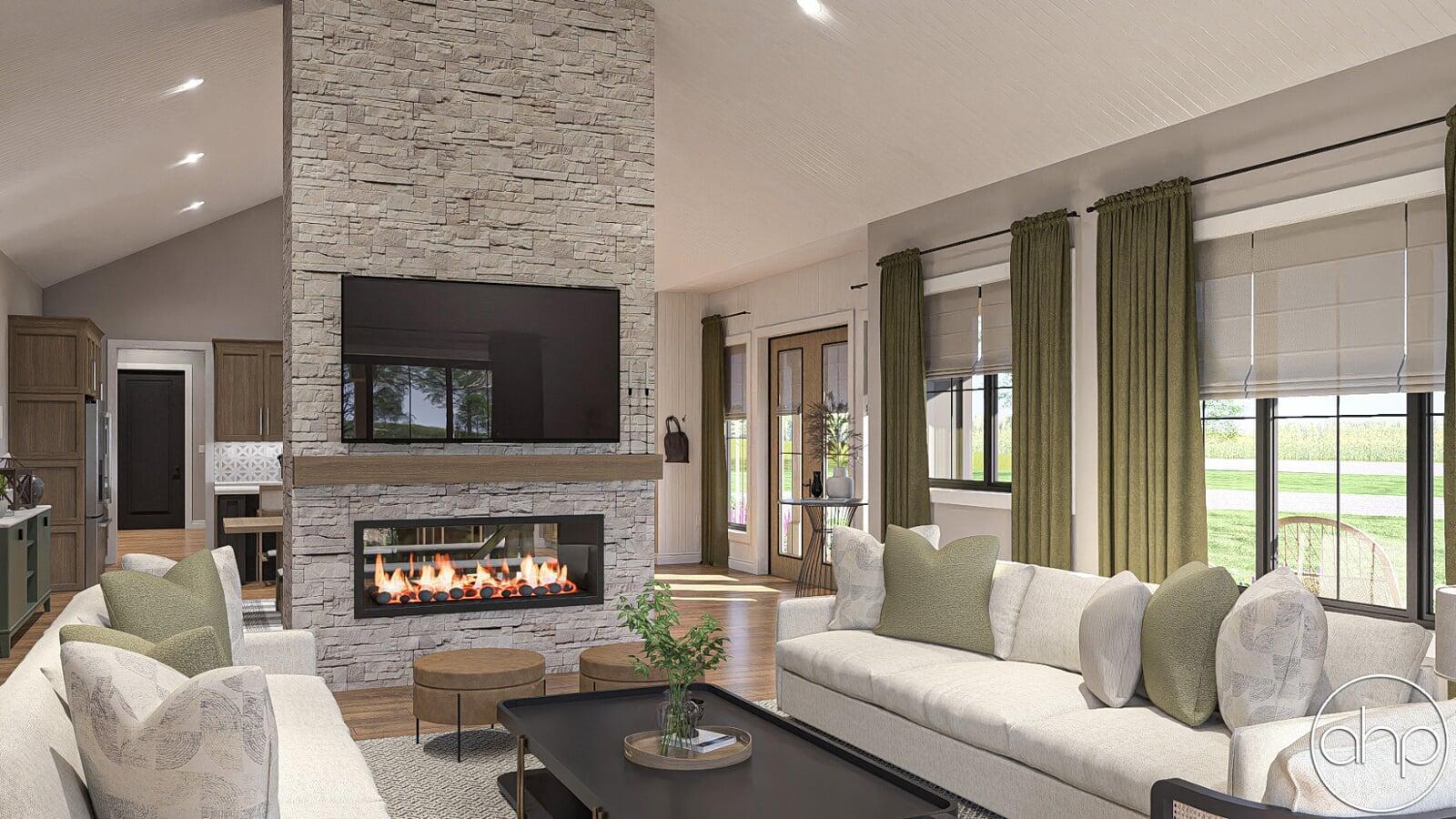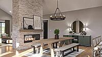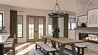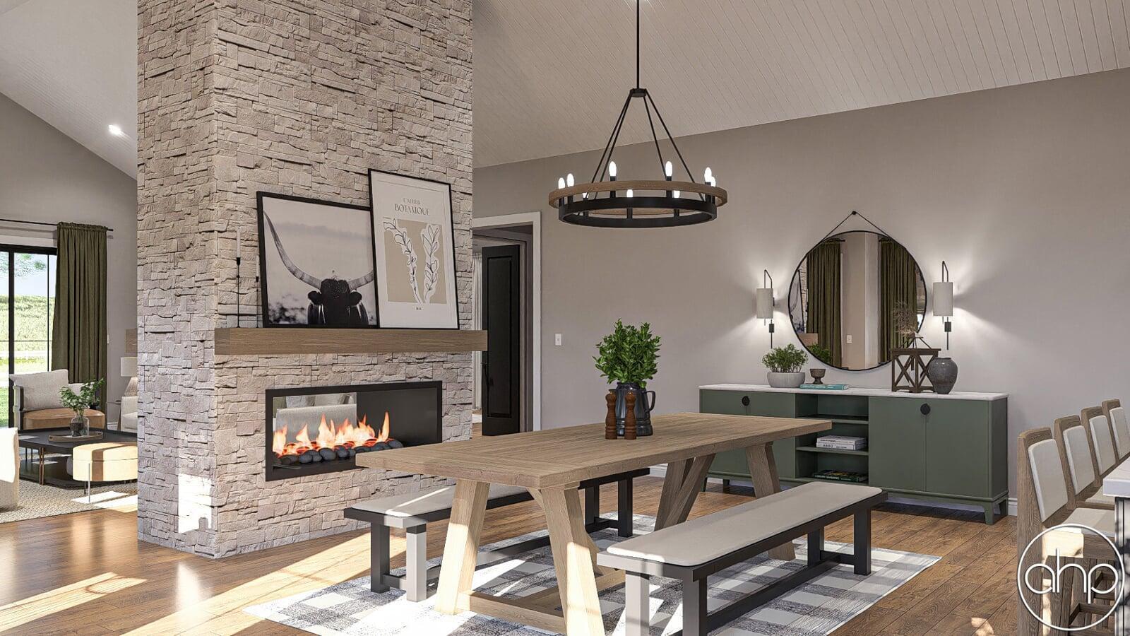 Inside, the heart of the home is an expansive open-concept living area where the kitchen, dining room, and great room flow seamlessly under a grand cathedral ceiling. A dual-sided fireplace divides the dining room and the great room, providing warmth and ambiance to both spaces.