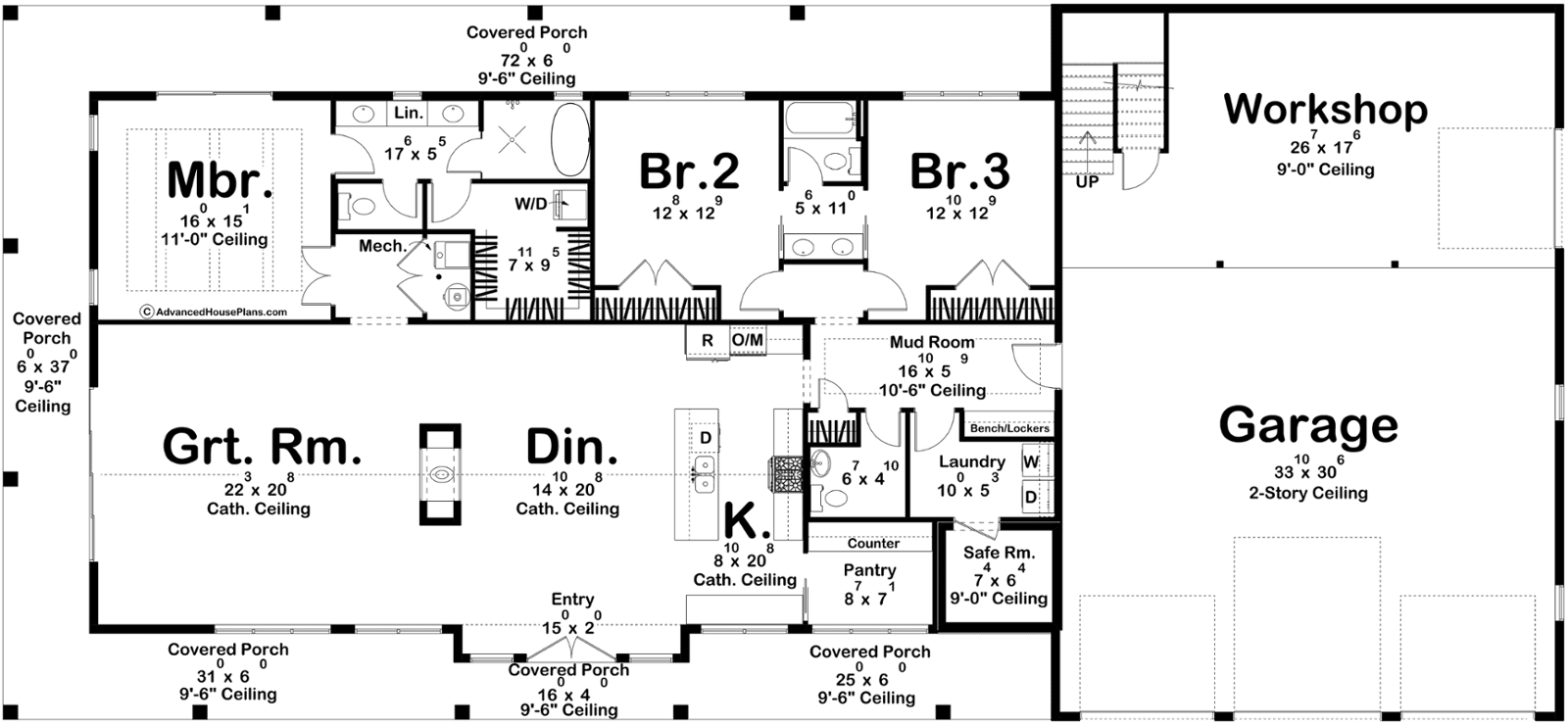 The home offers three bedrooms, including a well-appointed master suite. A key feature is the safe room, providing security and peace of mind. This barndominium plan offers a perfect balance of rustic aesthetics and modern convenience, making it an ideal home for living.