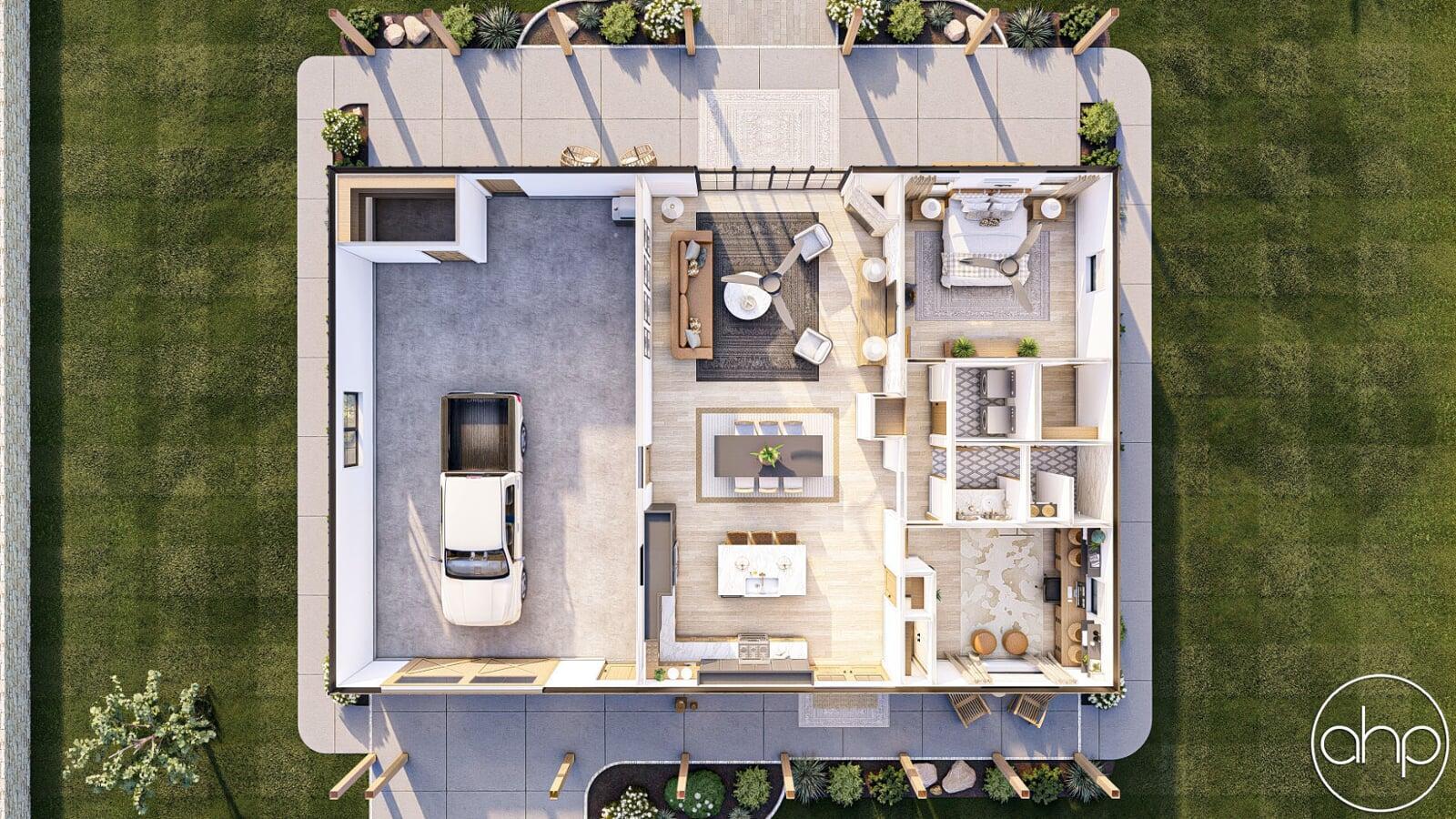 Nestled in the heart of rustic charm and modern convenience, this small barndominium house plan is a testament to efficient living with a touch of elegance. As you approach this unique home, you'll be greeted by the welcoming sight of a covered porch spanning the front and rear of the house, creating a perfect setting for quiet moments or gatherings with friends and family.