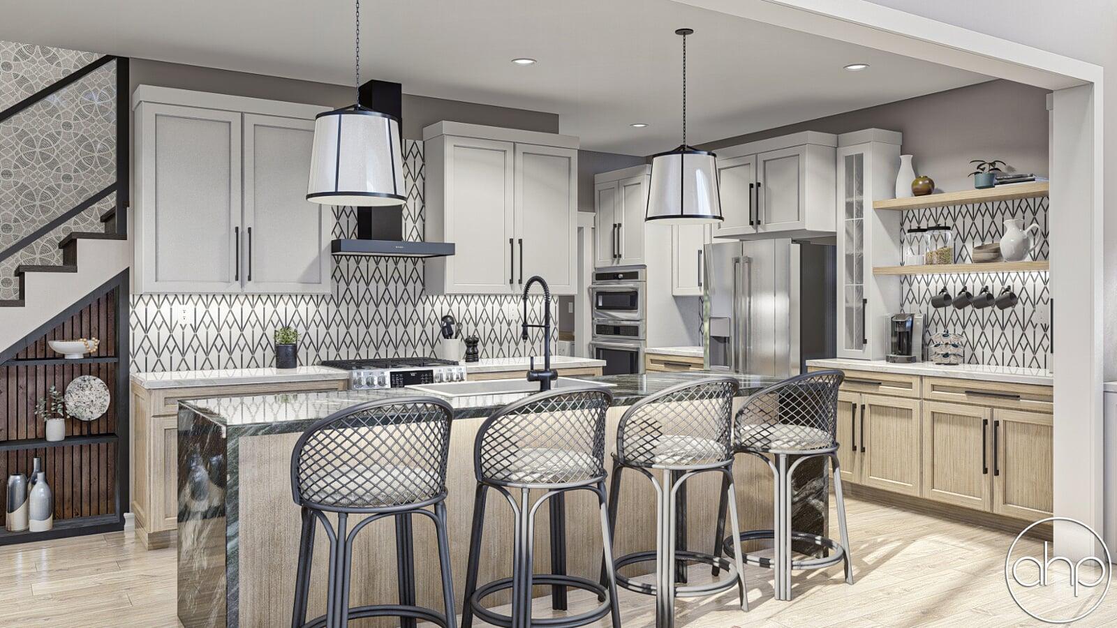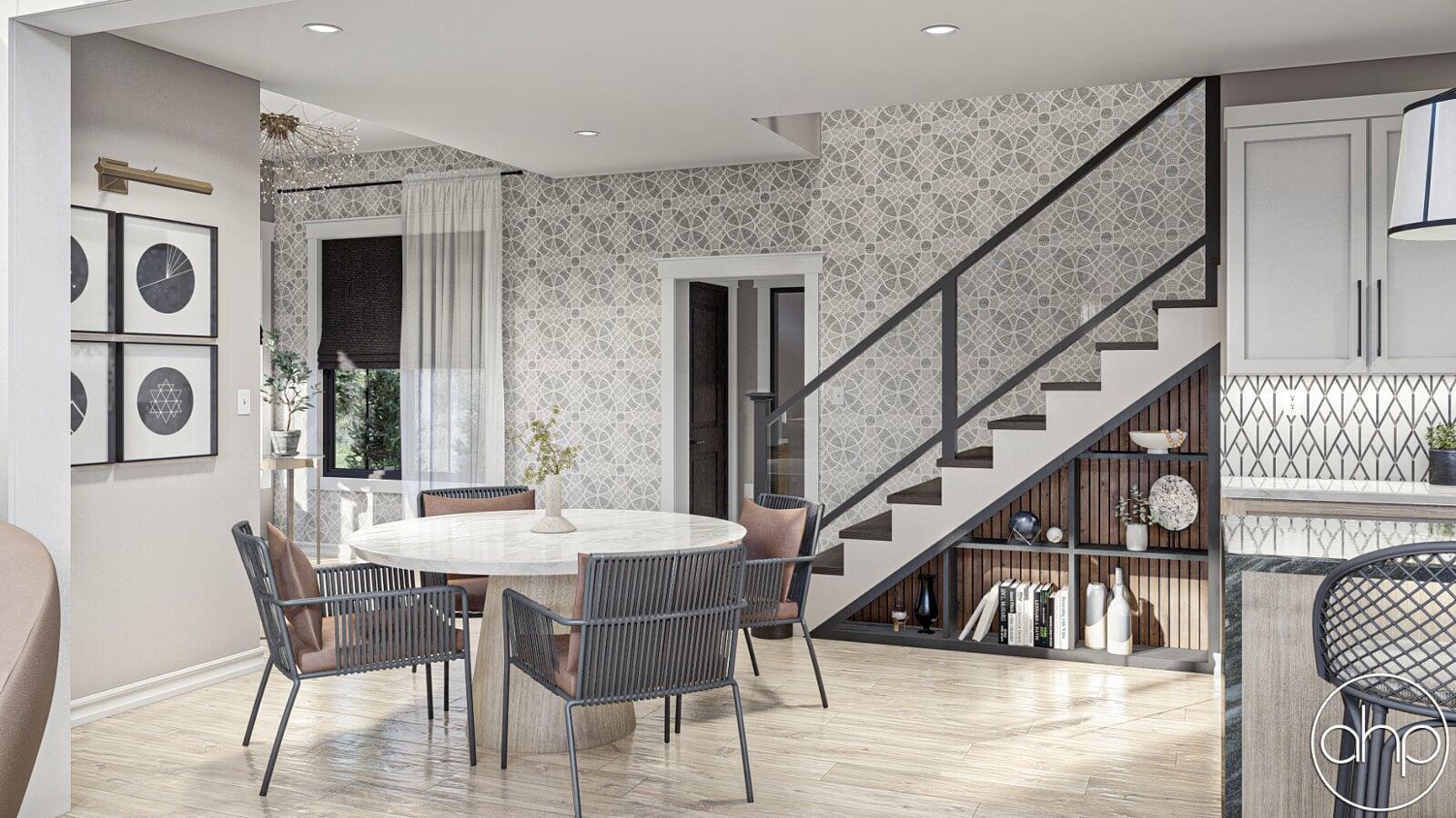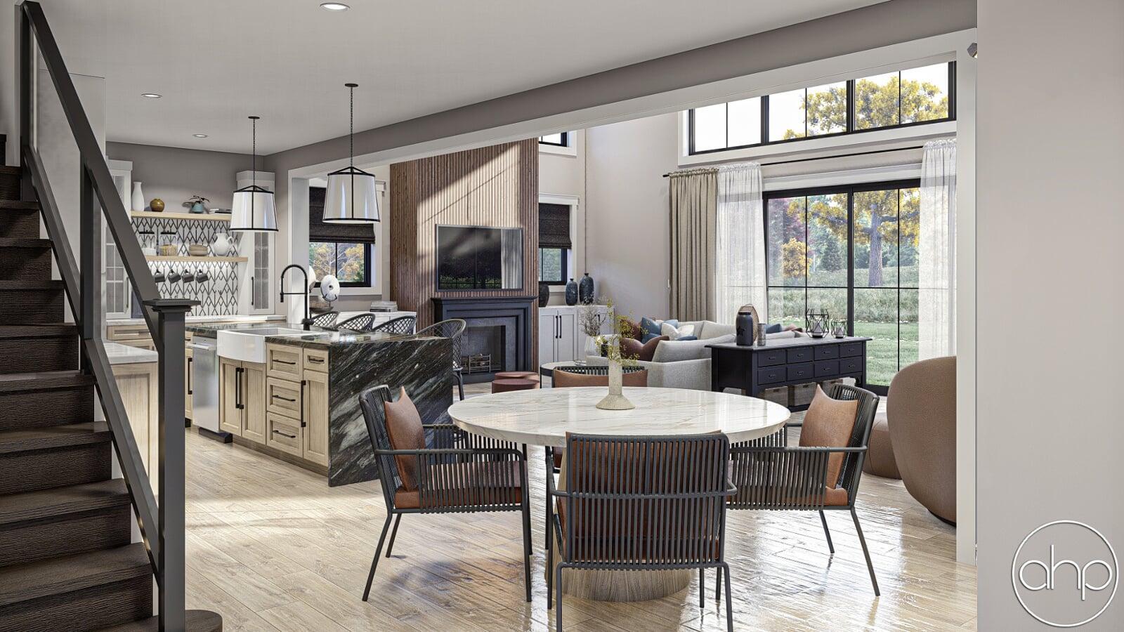 The heart of the house lies in the main floor's dining and kitchen areas, thoughtfully designed to be adjacent to each other, encouraging easy flow and a seamless dining experience. The kitchen is a chef's delight, featuring modern appliances, ample countertop space, and an exquisite blend of farmhouse-style cabinetry and modern fixtures.