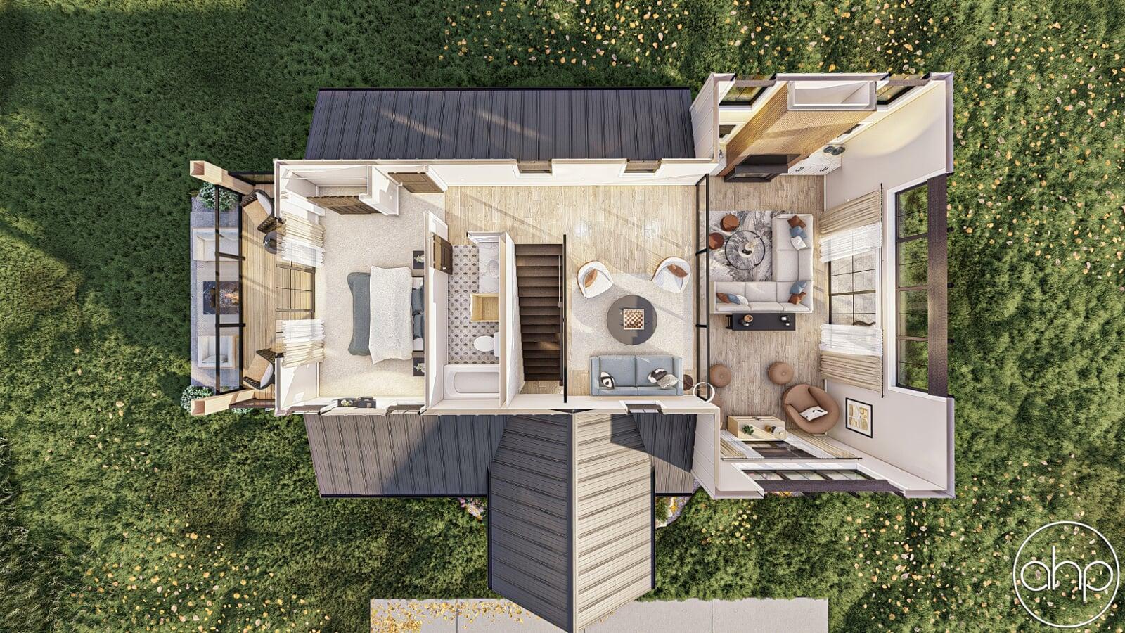 Finally, the second-floor covered deck features a decorative wood truss, enhancing the exterior's aesthetic appeal while providing a perfect spot for outdoor relaxation, stargazing, or entertaining guests.