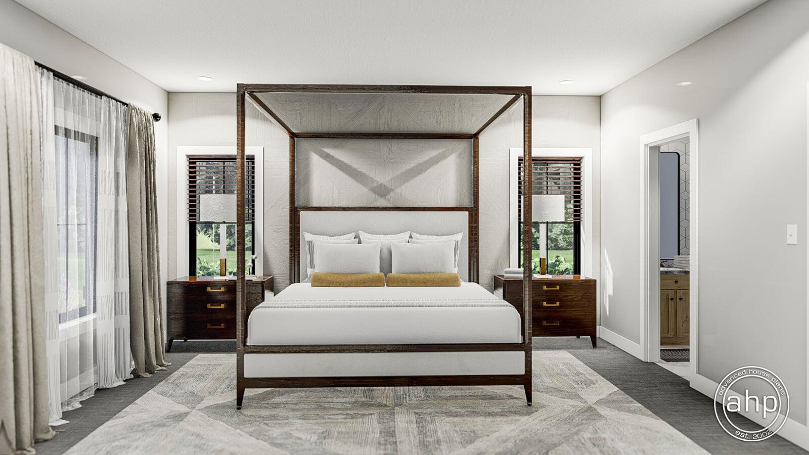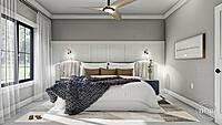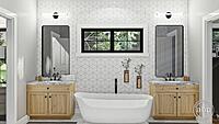 The master suite is situated on the right side of this Barndominium home for privacy. The master bathroom includes a soaking tub, his/her vanities, an enclosed toilet, and a walk-in shower. The master closet has convenient access to the laundry room.