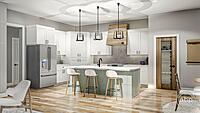 The great room, kitchen, and dining room flow seamlessly in a wide open layout. The high ceilings in the great room make the space feel massive. A fireplace warms the great room and is flanked by built-in bookshelves. The kitchen includes a large island and a walk-in pantry.
