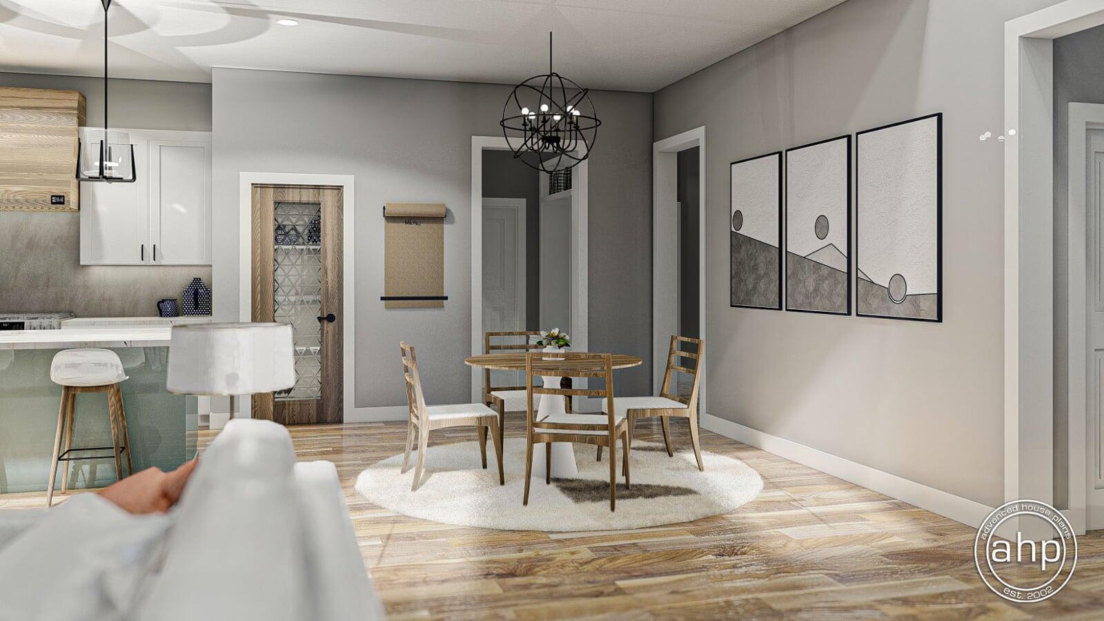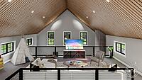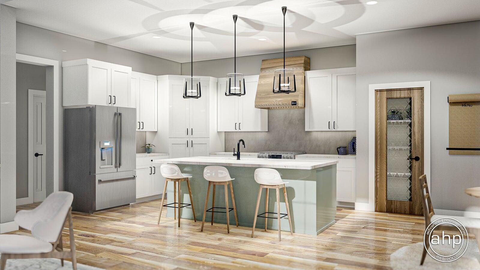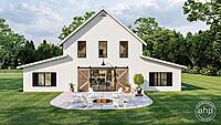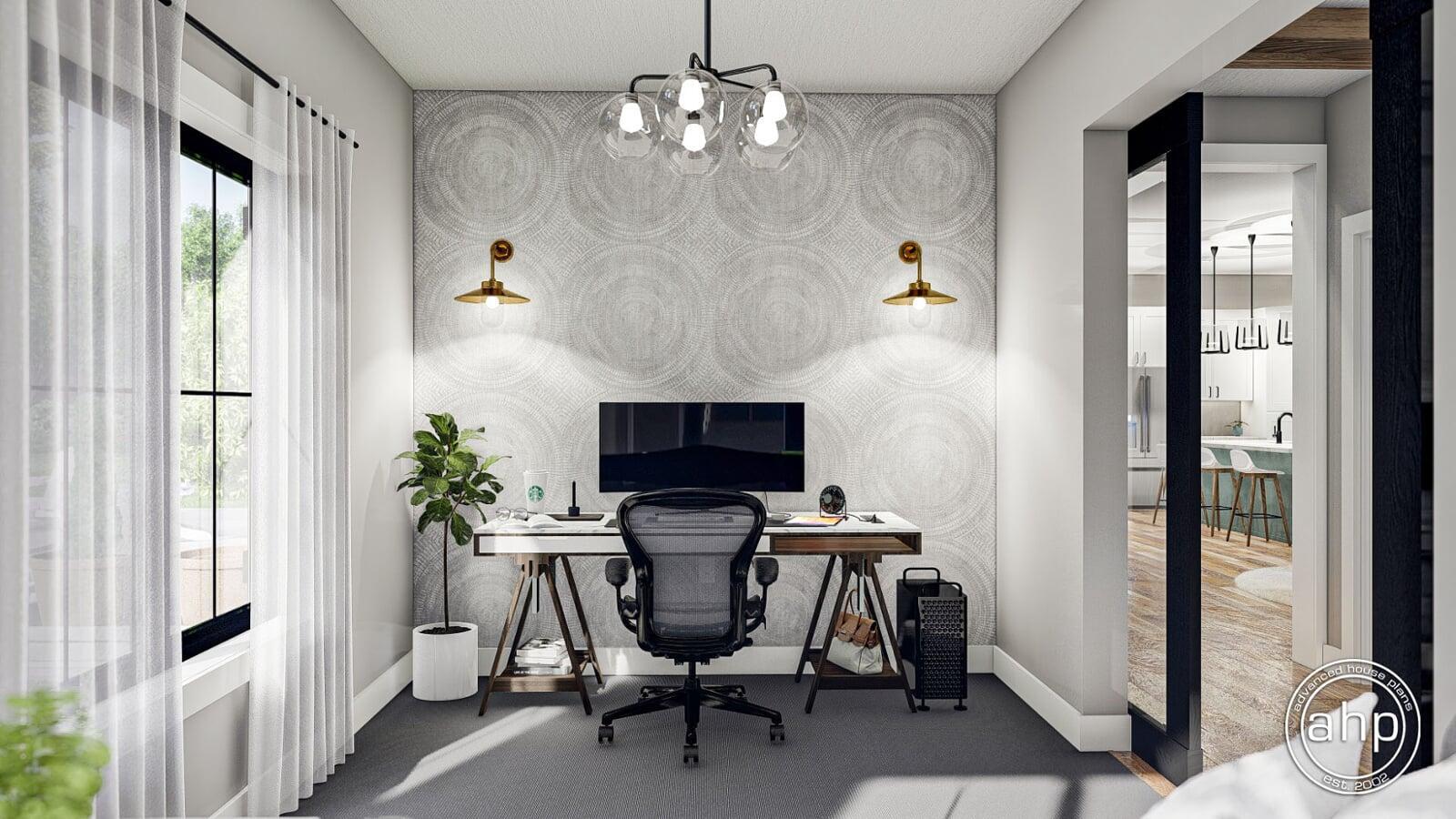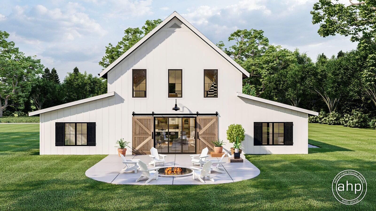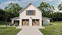 The Wakefield plan is a stunning Barndominium style house plan. The barn-like exterior showcases large windows, and barn doors. Just inside the side entry of the home, you'll find a practical office that is perfect for anyone who works from home.