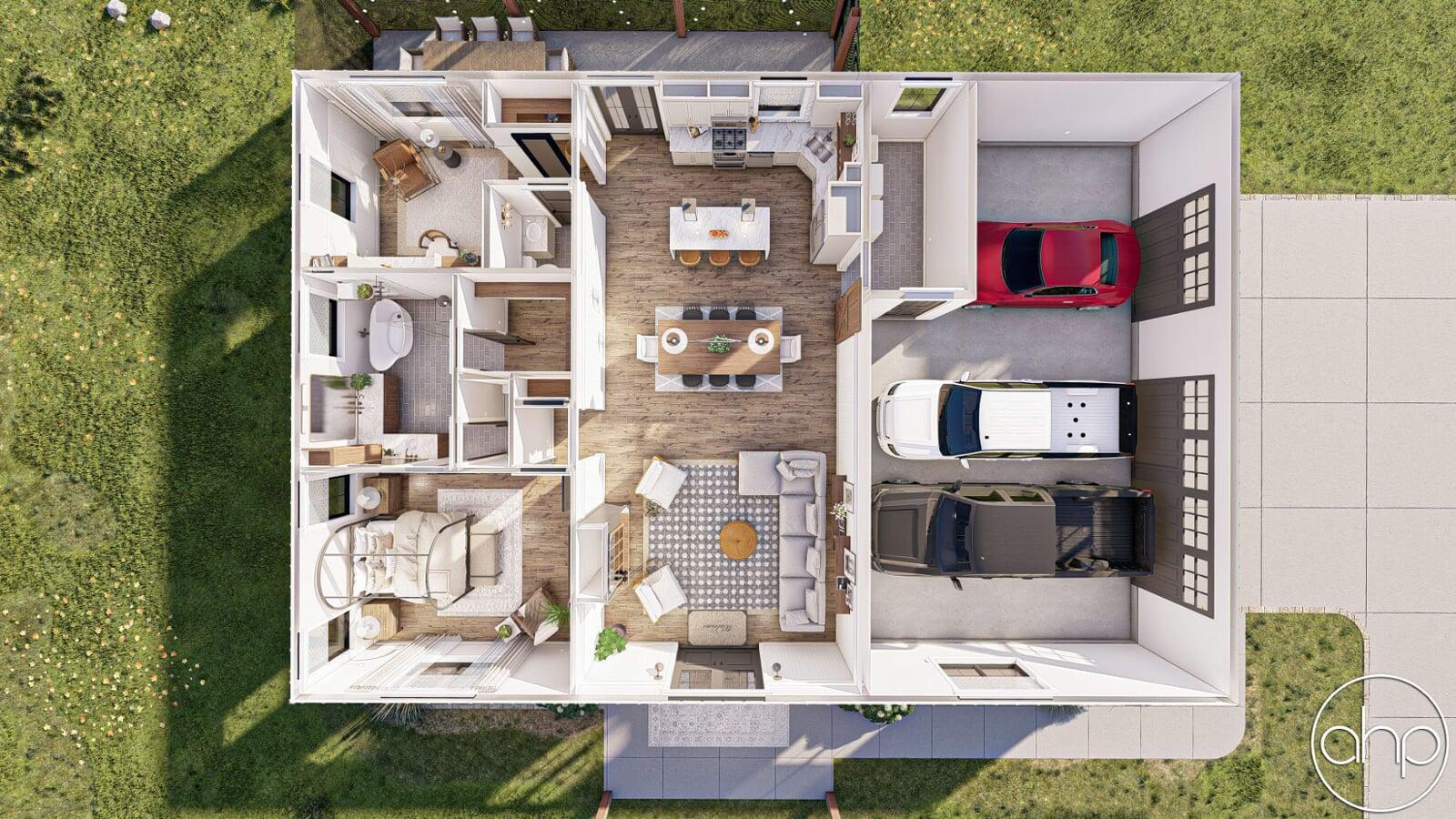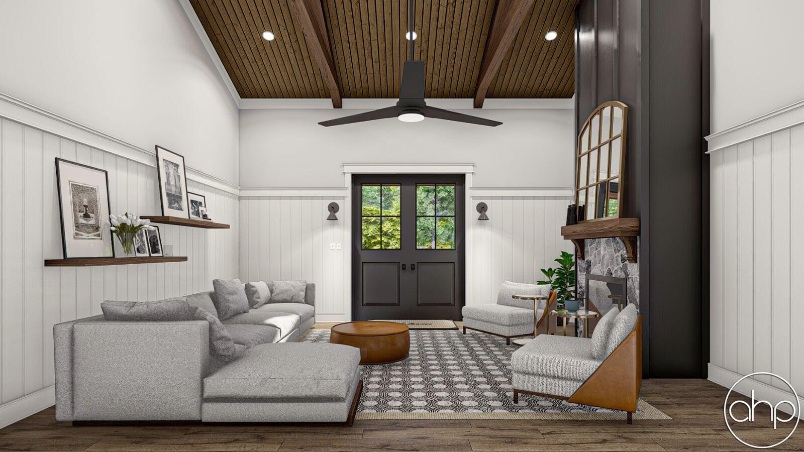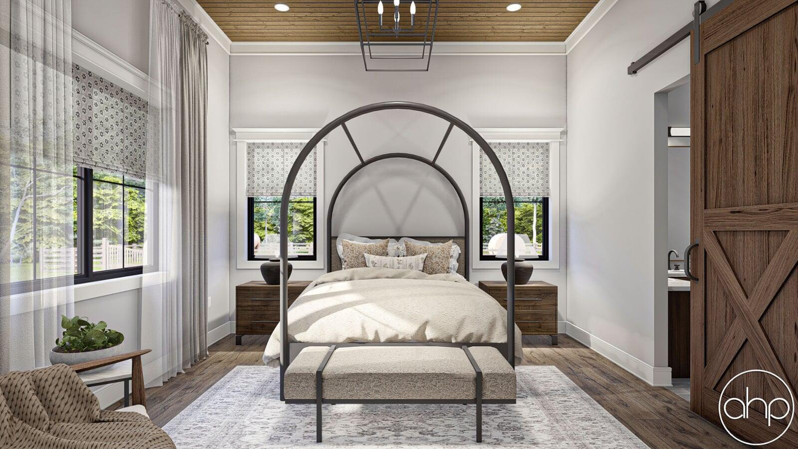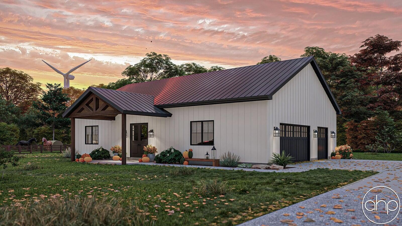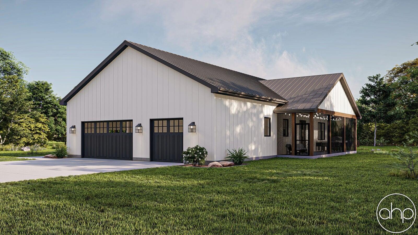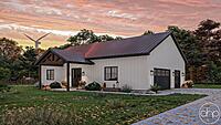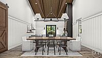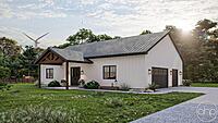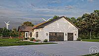 Adjacent to the kitchen, you'll find a conveniently located laundry room, just steps away from the two-car garage. The garage includes a third stall for storage and workshop space, catering to your practical needs while maintaining the architectural coherence of the Barndominium.
